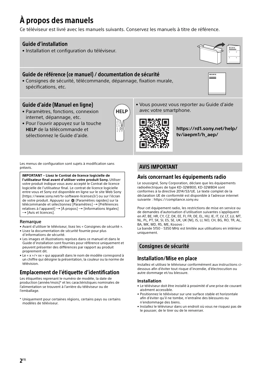 - Vous pouvez vous reporter au Guide d’aide avec votre smartphone. AVIS IMPORTANT Avis concernant les équipements radio Le soussigné, Sony Corporation, déclare que les équipements radioélectriques de type KD-32W800, KD-32W804 sont conformes à la directive 2014/53/UE. Le texte complet de la déclaration UE de conformité est disponible à l’adresse internet suivante : https://compliance.sony.eu Pour cet équipement radio, les restrictions de mise en service ou de demandes d’autorisation d’utilisation suivantes s’appliquent en AT, BE, HR, CY, CZ, DK, EE, FI, FR, DE, EL, HU, IE, IT, LV, LT, LU, MT, NL, PL, PT, SK, SI, ES, SE, UK, UK (NI), IS, LI, NO, CH, BG, RO, TR, AL, BA, MK, MD, RS, ME, Kosovo : La bande 5150 - 5350 MHz est limitée aux utilisations en intérieur uniquement. Consignes de sécurité Installation/Mise en place Installez et utilisez le téléviseur conformément aux instructions cidessous afin d’éviter tout risque d’incendie, d’électrocution ou autre dommage et/ou blessure. Installation