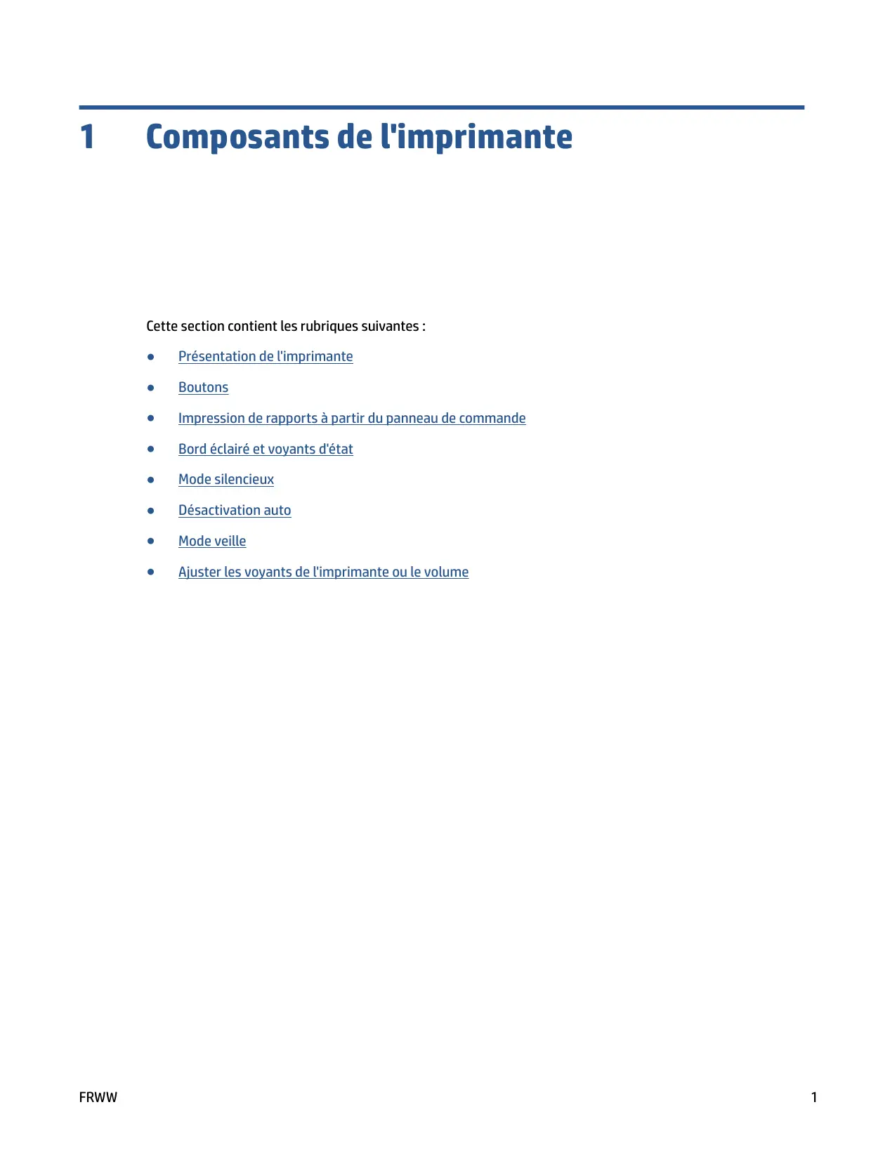 1 Composants de l'imprimante 1 Présentation de l'imprimante 2 Boutons 4 Impression de rapports à partir du panneau de commande 7 Bord éclairé et voyants d'état 8 Mode silencieux 14 Désactivation auto 15 Mode veille 16 Ajuster les voyants de l'imprimante ou le volume 17 2 Chargement du support et éléments de base concernant le papier 18 Chargement des supports 19 Chargement d'un original 22 Modifier le format de papier par défaut détecté par l'imprimante 23 Principes de base sur le papier 24 3 Connexion de votre imprimante 25 Exigences relatives aux imprimantes HP+ 26 Connectez-vous à l'aide de l'application HP Smart 27 Connexion à un réseau sans fil avec un routeur 28 Connexion sans fil sans routeur 31 Changer de type de connexion 35 Paramètres sans fil 36 Outils de gestion d'imprimante avancée (pour imprimantes sans fil) 37 Conseils pour la configuration et l'utilisation d'une imprimante sans fil 38 4 Outils de gestion de l'imprimante 39 Utilisez l'application HP Smart pour l'impression, la copie, la numérisation et le dépannage 40 Ouvrez le logiciel de l'imprimante HP logiciel d'impression (Windows) 41 Boîte à outils (Windows) 42 Serveur Web intégré 43