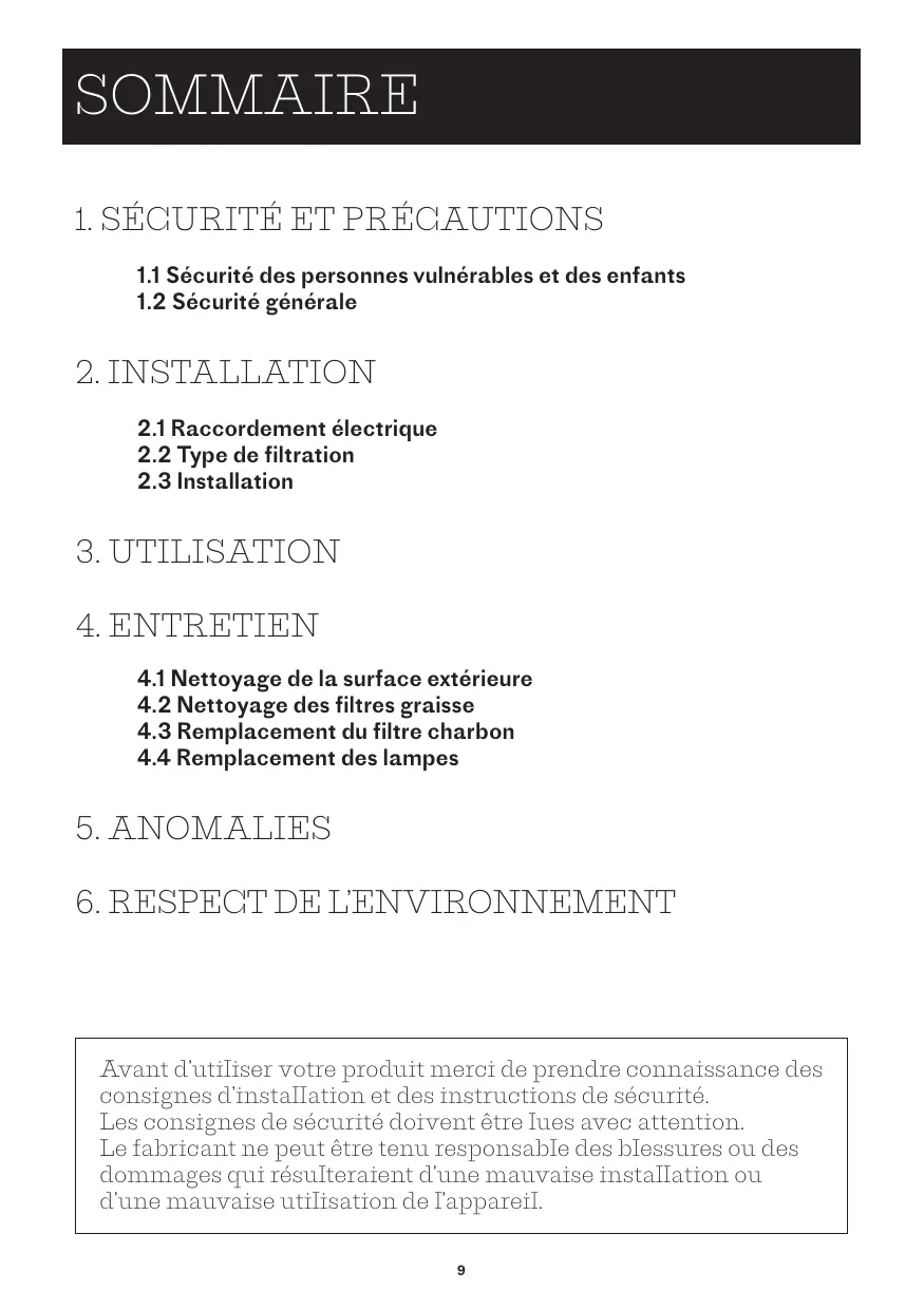 Assurez- vous que l’appareil est bien déconnecté avant de remplacer la lampe afin d’éviter un choc électrique. Si le câble d’alimentation est endommagé il doit être remplacé par le fabricant, son service après-vente ou une personne qualifiée afin d’éviter un danger. N’utilisez pas de nettoyeur vapeur ou à haute pression pour nettoyer votre hotte (exigences relatives à la sécurité électrique). Cet appareil est destiné à être utilisé dans des installations domestiques et analogues tels que les coins-cuisine réservés au personnel des magasins, bureaux et autres environnements professionnels ; les fermes ; l’utilisation par les clients des hôtels, motels et autres environnements de type chambre d’hôte. Ne l’utilisez pas à des fins commerciales ou industrielles ou pour d’autres buts que celui pour lequel il a été conçu. Risques d’asphyxie Les réglementations concernant l’évacuation de l’air doivent être respectées. L’air ne doit pas être envoyé dans un conduit utilisé pour évacuer les fumées d’appareils utilisant du gaz ou un autre combustible (ne s’applique pas aux appareils qui renvoient uniquement l’air dans la pièce).