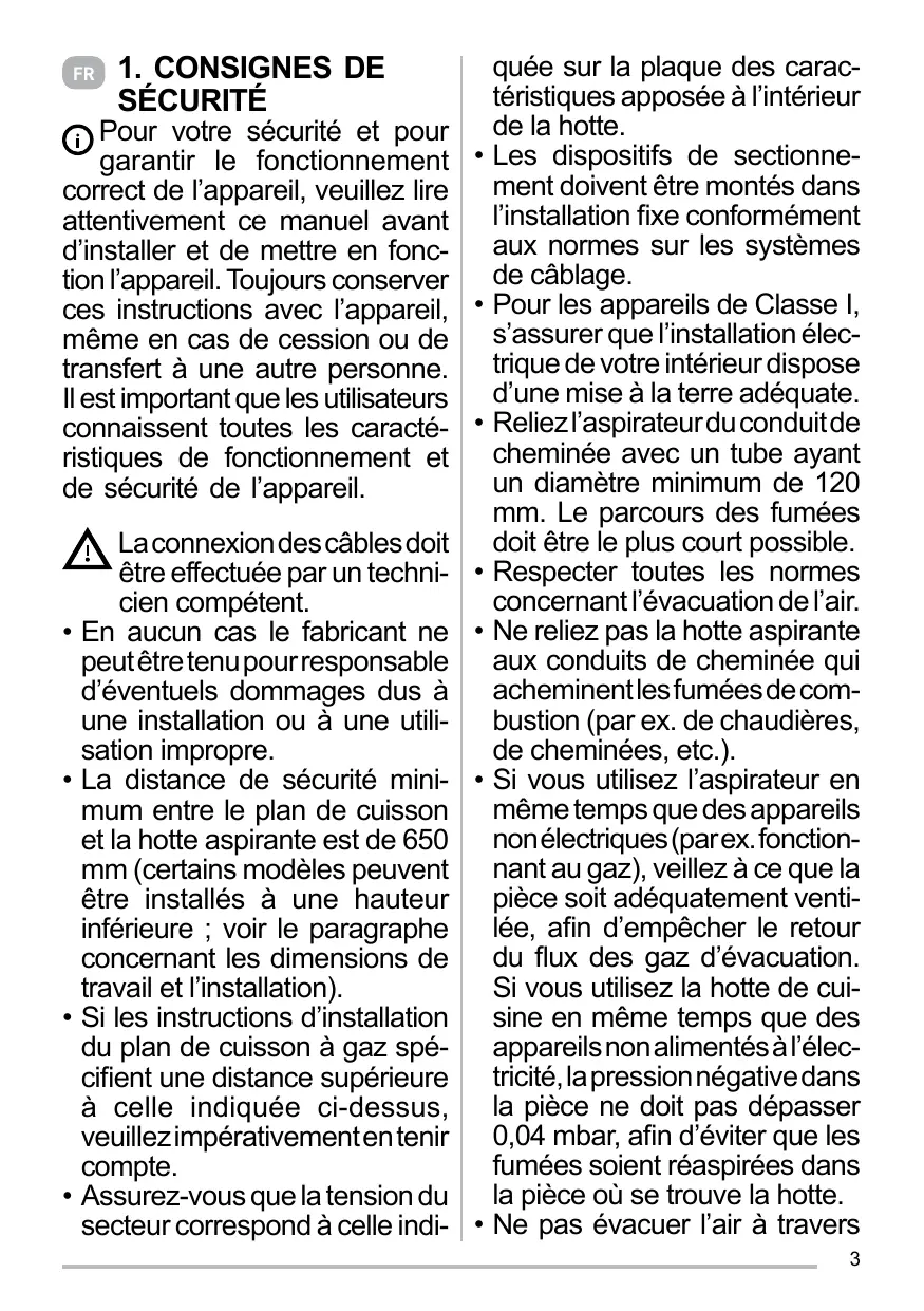 Les dispositifs de sectionnement doivent être montés dans l’installation fixe conformément aux normes sur les systèmes de câblage. Pour les appareils de Classe I, s’assurer que l’installation électrique de votre intérieur dispose d’une mise à la terre adéquate. Reliez l’aspirateur du conduit de cheminée avec un tube ayant un diamètre minimum de 120 mm. Le parcours des fumées doit être le plus court possible. Respecter toutes les normes concernant l’évacuation de l’air. Ne reliez pas la hotte aspirante aux conduits de cheminée qui acheminent les fumées de combustion (par ex. de chaudières, de cheminées, etc.). Si vous utilisez l’aspirateur en même temps que des appareils non électriques (par ex. fonctionnant au gaz), veillez à ce que la pièce soit adéquatement ventilée, afin d’empêcher le retour du flux des gaz d’évacuation. Si vous utilisez la hotte de cuisine en même temps que des appareils non alimentés à l’électricité, la pression négative dans la pièce ne doit pas dépasser 0,04 mbar, afin d’éviter que les fumées soient réaspirées dans la pièce où se trouve la hotte. Ne pas évacuer l’air à travers 3