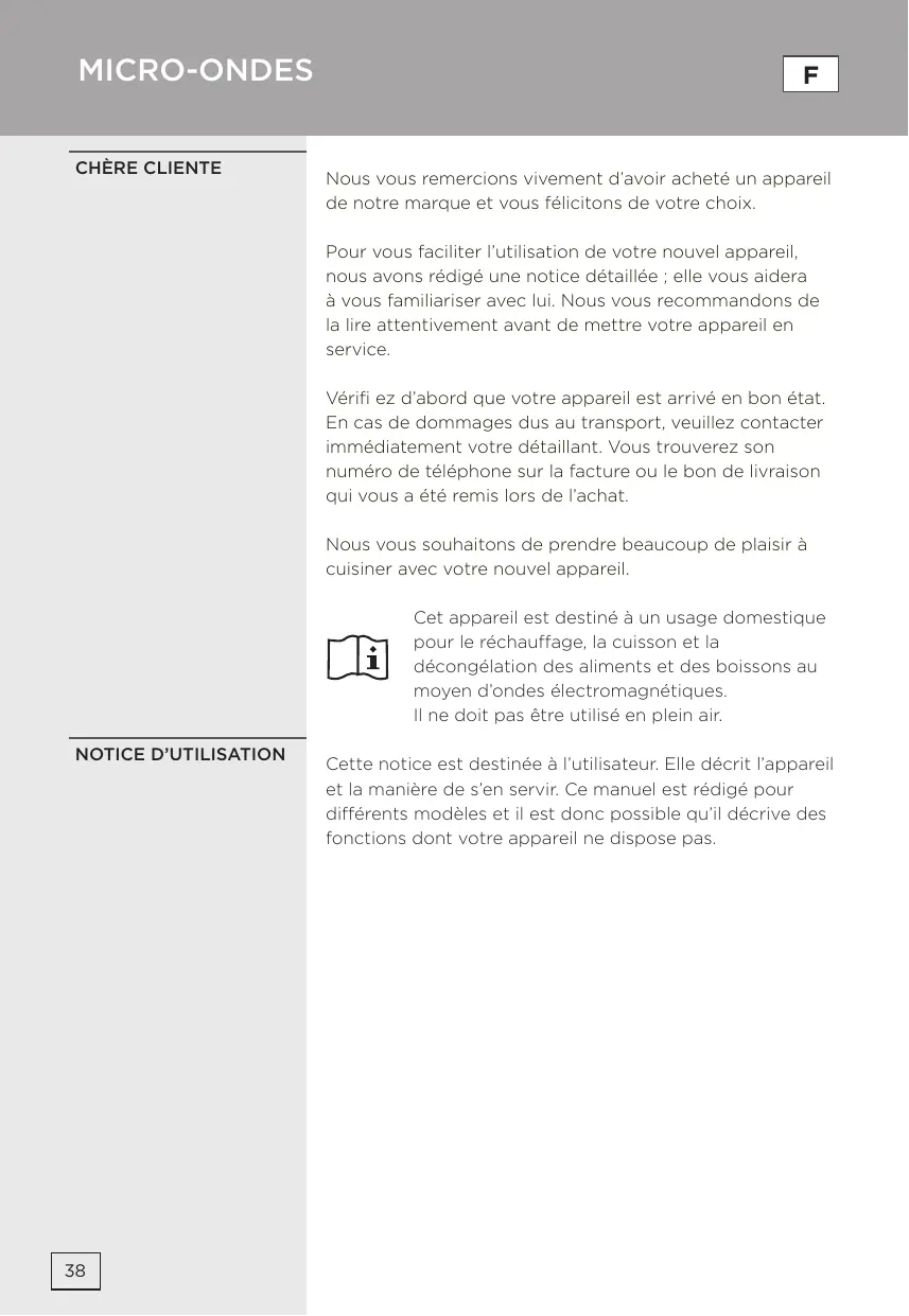 Nous vous remercions vivement d’avoir acheté un appareil de notre marque et vous félicitons de votre choix. Pour vous faciliter l’utilisation de votre nouvel appareil, nous avons rédigé une notice détaillée ; elle vous aidera à vous familiariser avec lui. Nous vous recommandons de la lire attentivement avant de mettre votre appareil en service. Vérifi ez d’abord que votre appareil est arrivé en bon état. En cas de dommages dus au transport, veuillez contacter immédiatement votre détaillant. Vous trouverez son numéro de téléphone sur la facture ou le bon de livraison qui vous a été remis lors de l’achat. Nous vous souhaitons de prendre beaucoup de plaisir à cuisiner avec votre nouvel appareil. Cet appareil est destiné à un usage domestique pour le réchauffage, la cuisson et la décongélation des aliments et des boissons au moyen d’ondes électromagnétiques. Il ne doit pas être utilisé en plein air.