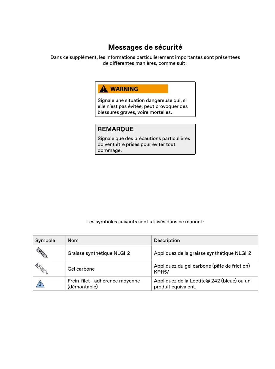 © 2019 Cycling Sports Group Topstone Owner’s Manual Supplement 134949 Rev. 1 Messages de sécurité Dans ce supplément, les informations particulièrement importantes sont présentées de différentes manières, comme suit : Signale une situation dangereuse qui, si elle n‘est pas évitée, peut provoquer des blessures graves, voire mortelles. REMARQUE Signale que des précautions particulières doivent être prises pour éviter tout dommage. Les symboles suivants sont utilisés dans ce manuel : Symbole