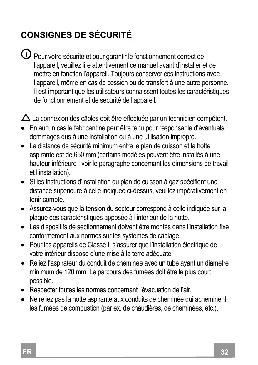 En aucun cas le fabricant ne peut être tenu pour responsable d’éventuels dommages dus à une installation ou à une utilisation impropre. La distance de sécurité minimum entre le plan de cuisson et la hotte aspirante est de 650 mm (certains modèles peuvent être installés à une hauteur inférieure ; voir le paragraphe concernant les dimensions de travail et l’installation). Si les instructions d’installation du plan de cuisson à gaz spécifient une distance supérieure à celle indiquée ci-dessus, veuillez impérativement en tenir compte. Assurez-vous que la tension du secteur correspond à celle indiquée sur la plaque des caractéristiques apposée à l’intérieur de la hotte. Les dispositifs de sectionnement doivent être montés dans l’installation fixe conformément aux normes sur les systèmes de câblage. Pour les appareils de Classe I, s’assurer que l’installation électrique de votre intérieur dispose d’une mise à la terre adéquate. Reliez l’aspirateur du conduit de cheminée avec un tube ayant un diamètre minimum de 120 mm. Le parcours des fumées doit être le plus court possible. Respecter toutes les normes concernant l’évacuation de l’air. Ne reliez pas la hotte aspirante aux conduits de cheminée qui acheminent les fumées de combustion (par ex. de chaudières, de cheminées, etc.).