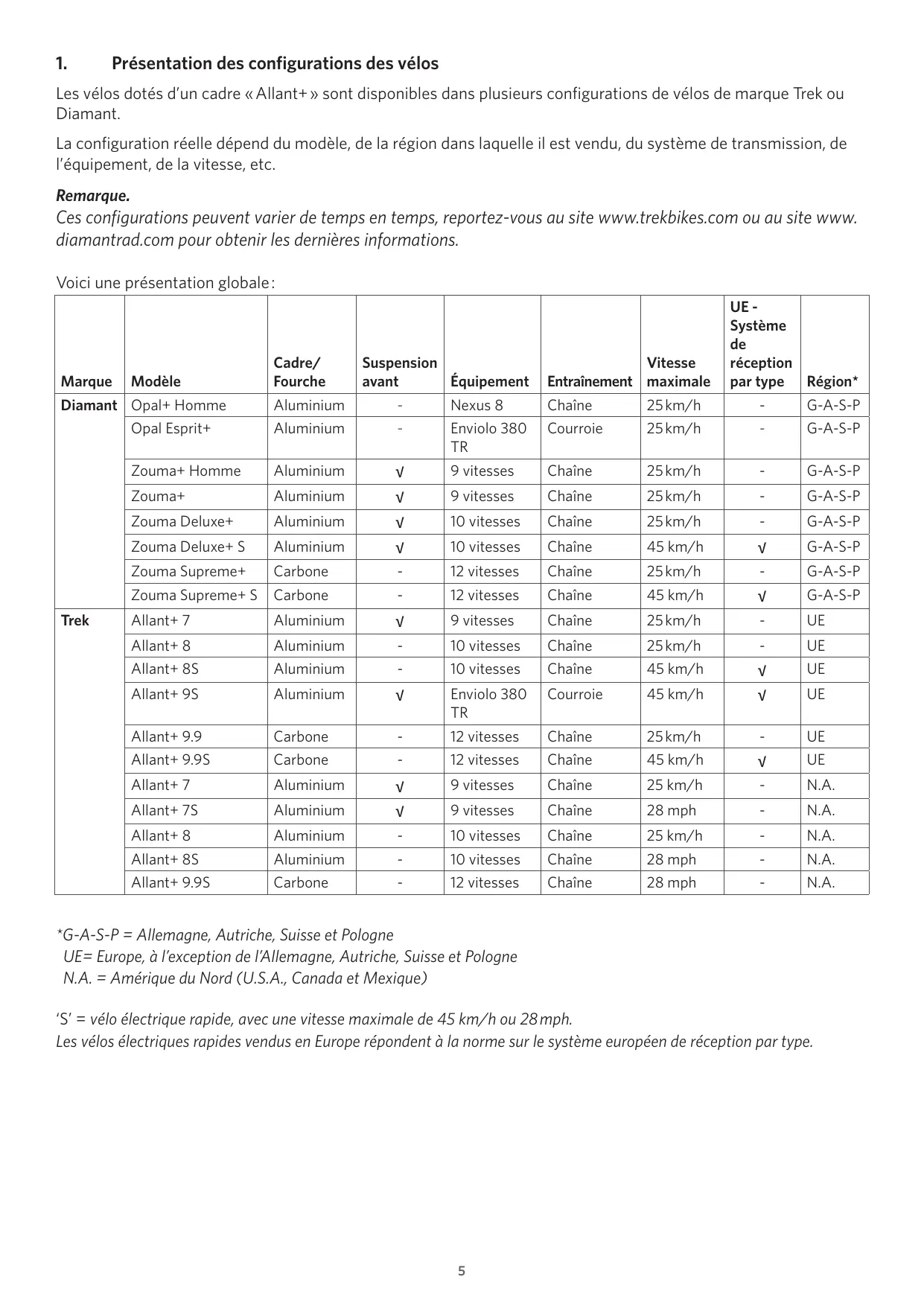 Pour des informations « générales » sur les vélos, veuillez vous reporter au manuel de l'utilisateur Trek ou Diamant, fourni avec le vélo.