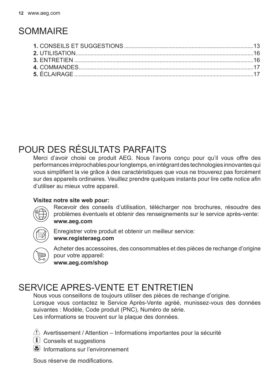 Visitez notre site web pour: Recevoir des conseils d’utilisation, télécharger nos brochures, résoudre des problèmes éventuels et obtenir des renseignements sur le service après-vente: www.aeg.com Enregistrer votre produit et obtenir un meilleur service: www.registeraeg.com Acheter des accessoires, des consommables et des pièces de rechange d’origine pour votre appareil: www.aeg.com/shop