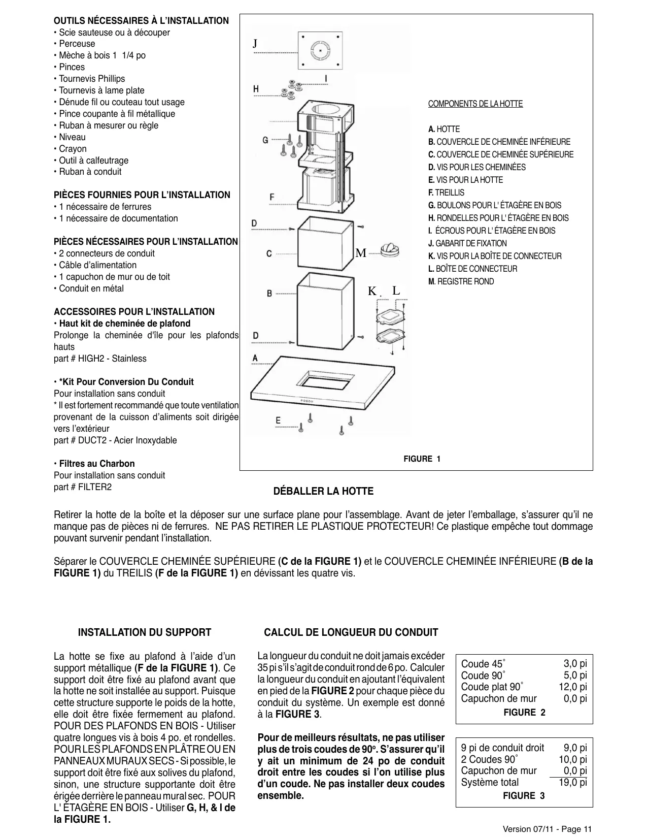 AVERTISSEMENT: - POUR PRÉVENIR LES BLESSURES EN CAS DE FEU SUIVRE LES RECOMMANDATIONS SUIVANTES (*): a) ÉTOUFFEZ LE FEU avec un couvercle métallique et fermez le brûleur. Si le feu ne s'éteint pas tout de suite, QUITTEZ LES LIEUX ET APPELEZ LES POMPIERS. b) NE TOUCHEZ JAMAIS UNE CASSEROLE EN FLAMMES. c) N'UTILISEZ JAMAIS DE L'EAU ou un torchon mouillé pour éteindre le feu - ce qui pourrait causer une explosion de vapeur. d) N'utilisez un extincteur que si: 1. Vous avez un modèle ABC et vous connaissez bien son mode d'emploi. 2. Le feu est petit et peu répandu. 3. Les pompiers sont déjà prévenus. 4. Vous avez une sortie derrière vous. (*) Basé sur la "cuisine Firesafety incline" édité par NFPA. TOUTE OUVERTURE DANS LE MUR OU LE PLANCHER À PROXIMITÉ DE LA HOTTE DOIT ÊTRE SCELLÉ Gardez 24 po. de hauteur entre le bas de la hotte et la surface de cuisson. Cette hauteur minimum peut être plus haute suivant le code municipal. Par exemple, les cuisinières à gaz peuvent requérir 30 po. de hauteur. Les armoires au-dessus de chaque côté devront être au moins à 18 po. au-dessus de la surface de cuisson. Consultez la fiche technique avant de découper les armoires. Version 07/11 - Page 1