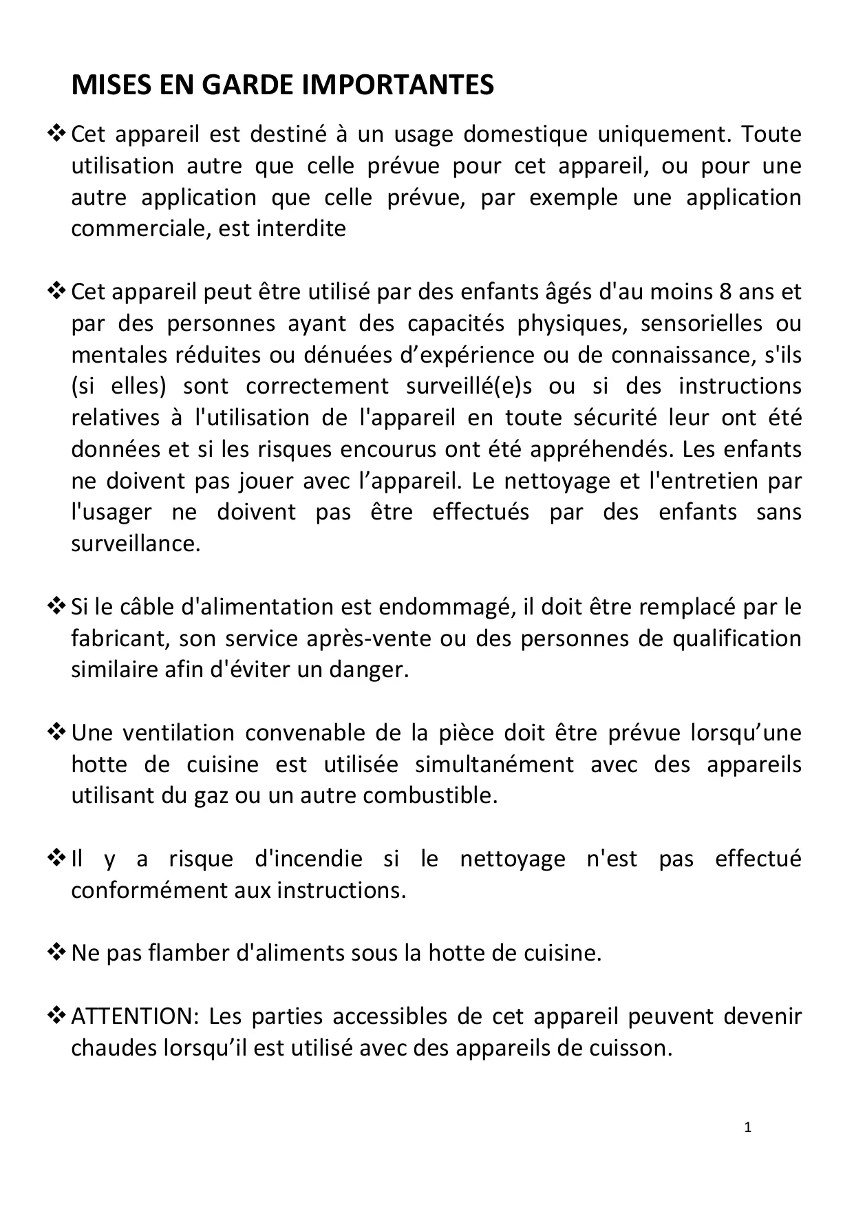 MANUEL D’UTILISATION OPERATING INSTRUCTIONS HANDLEIDING MISES EN GARDE IMPORTANTES Cet appareil est destiné à un usage domestique uniquement. Toute utilisation autre que celle prévue pour cet appareil, ou pour une autre application que celle prévue, par exemple une application commerciale, est interdite Cet appareil peut être utilisé par des enfants âgés d'au moins 8 ans et par des personnes ayant des capacités physiques, sensorielles ou mentales réduites ou dénuées d’expérience ou de connaissance, s'ils (si elles) sont correctement surveillé(e)s ou si des instructions relatives à l'utilisation de l'appareil en toute sécurité leur ont été données et si les risques encourus ont été appréhendés. Les enfants ne doivent pas jouer avec l’appareil. Le nettoyage et l'entretien par l'usager ne doivent pas être effectués par des enfants sans surveillance. Si le câble d'alimentation est endommagé, il doit être remplacé par le fabricant, son service après-vente ou des personnes de qualification similaire afin d'éviter un danger. Une ventilation convenable de la pièce doit être prévue lorsqu’une hotte de cuisine est utilisée simultanément avec des appareils utilisant du gaz ou un autre combustible. Il y a risque d'incendie si le nettoyage n'est pas effectué conformément aux instructions. Ne pas flamber d'aliments sous la hotte de cuisine. ATTENTION: Les parties accessibles de cet appareil peuvent devenir chaudes lorsqu’il est utilisé avec des appareils de cuisson. 1