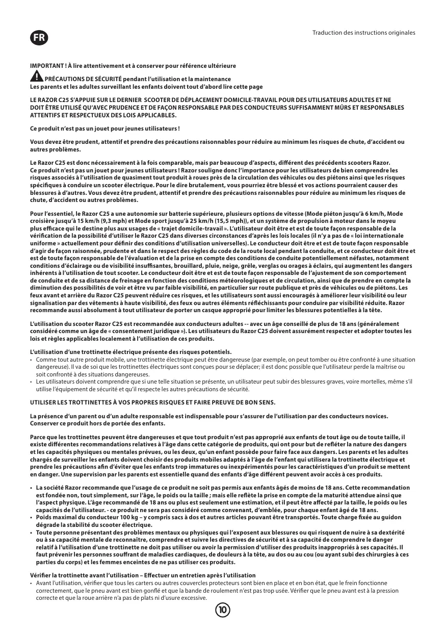 Ce produit n’est pas un jouet pour jeunes utilisateurs ! Vous devez être prudent, attentif et prendre des précautions raisonnables pour réduire au minimum les risques de chute, d’accident ou autres problèmes. Le Razor C25 est donc nécessairement à la fois comparable, mais par beaucoup d’aspects, différent des précédents scooters Razor. Ce produit n’est pas un jouet pour jeunes utilisateurs ! Razor souligne donc l’importance pour les utilisateurs de bien comprendre les risques associés à l’utilisation de quasiment tout produit à roues près de la circulation des véhicules ou des piétons ainsi que les risques spécifiques à conduire un scooter électrique. Pour le dire brutalement, vous pourriez être blessé et vos actions pourraient causer des blessures à d’autres. Vous devez être prudent, attentif et prendre des précautions raisonnables pour réduire au minimum les risques de chute, d’accident ou autres problèmes. Pour l’essentiel, le Razor C25 a une autonomie sur batterie supérieure, plusieurs options de vitesse (Mode piéton jusqu’à 6 km/h, Mode croisière jusqu’à 15 km/h (9,3 mph) et Mode sport jusqu’à 25 km/h (15,5 mph)), et un système de propulsion à moteur dans le moyeu plus efficace qui le destine plus aux usages de « trajet domicile-travail ». L’utilisateur doit être et est de toute façon responsable de la vérification de la possibilité d’utiliser le Razor C25 dans diverses circonstances d’après les lois locales (il n’y a pas de « loi internationale uniforme » actuellement pour définir des conditions d’utilisation universelles). Le conducteur doit être et est de toute façon responsable d’agir de façon raisonnée, prudente et dans le respect des règles du code de la route local pendant la conduite, et ce conducteur doit être et est de toute façon responsable de l’évaluation et de la prise en compte des conditions de conduite potentiellement néfastes, notamment conditions d’éclairage ou de visibilité insuffisantes, brouillard, pluie, neige, grêle, verglas ou orages à éclairs, qui augmentent les dangers inhérents à l’utilisation de tout scooter. Le conducteur doit être et est de toute façon responsable de l’ajustement de son comportement de conduite et de sa distance de freinage en fonction des conditions météorologiques et de circulation, ainsi que de prendre en compte la diminution des possibilités de voir et être vu par faible visibilité, en particulier sur route publique et près de véhicules ou de piétons. Les feux avant et arrière du Razor C25 peuvent réduire ces risques, et les utilisateurs sont aussi encouragés à améliorer leur visibilité ou leur signalisation par des vêtements à haute visibilité, des feux ou autres éléments réfléchissants pour conduire par visibilité réduite. Razor recommande aussi absolument à tout utilisateur de porter un casque approprié pour limiter les blessures potentielles à la tête. L’utilisation du scooter Razor C25 est recommandée aux conducteurs adultes -- avec un âge conseillé de plus de 18 ans (généralement considéré comme un âge de « consentement juridique »). Les utilisateurs du Razor C25 doivent assurément respecter et adopter toutes les lois et règles applicables localement à l’utilisation de ces produits. L’utilisation d’une trottinette électrique présente des risques potentiels. • Comme tout autre produit mobile, une trottinette électrique peut être dangereuse (par exemple, on peut tomber ou être confronté à une situation dangereuse). Il va de soi que les trottinettes électriques sont conçues pour se déplacer; il est donc possible que l’utilisateur perde la maîtrise ou soit confronté à des situations dangereuses. • Les utilisateurs doivent comprendre que si une telle situation se présente, un utilisateur peut subir des blessures graves, voire mortelles, même s’il utilise l’équipement de sécurité et qu’il respecte les autres précautions de sécurité. UTILISER LES TROTTINETTES À VOS PROPRES RISQUES ET FAIRE PREUVE DE BON SENS. La présence d’un parent ou d’un adulte responsable est indispensable pour s’assurer de l’utilisation par des conducteurs novices. Conserver ce produit hors de portée des enfants. Parce que les trottinettes peuvent être dangereuses et que tout produit n’est pas approprié aux enfants de tout âge ou de toute taille, il existe différentes recommandations relatives à l’âge dans cette catégorie de produits, qui ont pour but de refléter la nature des dangers et les capacités physiques ou mentales prévues, ou les deux, qu’un enfant possède pour faire face aux dangers. Les parents et les adultes chargés de surveiller les enfants doivent choisir des produits mobiles adaptés à l’âge de l’enfant qui utilisera la trottinette électrique et prendre les précautions afin d’éviter que les enfants trop immatures ou inexpérimentés pour les caractéristiques d’un produit se mettent en danger. Une supervision par les parents est essentielle quand des enfants d’âge différent peuvent avoir accès à ces produits. • La société Razor recommande que l’usage de ce produit ne soit pas permis aux enfants âgés de moins de 18 ans. Cette recommandation est fondée non, tout simplement, sur l’âge, le poids ou la taille ; mais elle reflète la prise en compte de la maturité attendue ainsi que l’aspect physique. L’âge recommandé de 18 ans ou plus est seulement une estimation, et il peut être affecté par la taille, le poids ou les capacités de l’utilisateur. - ce produit ne sera pas considéré comme convenant, d’emblée, pour chaque enfant âgé de 18 ans. • Poids maximal du conducteur 100 kg – y compris sacs à dos et autres articles pouvant être transportés. Toute charge fixée au guidon dégrade la stabilité du scooter électrique. • Toute personne présentant des problèmes mentaux ou physiques 
