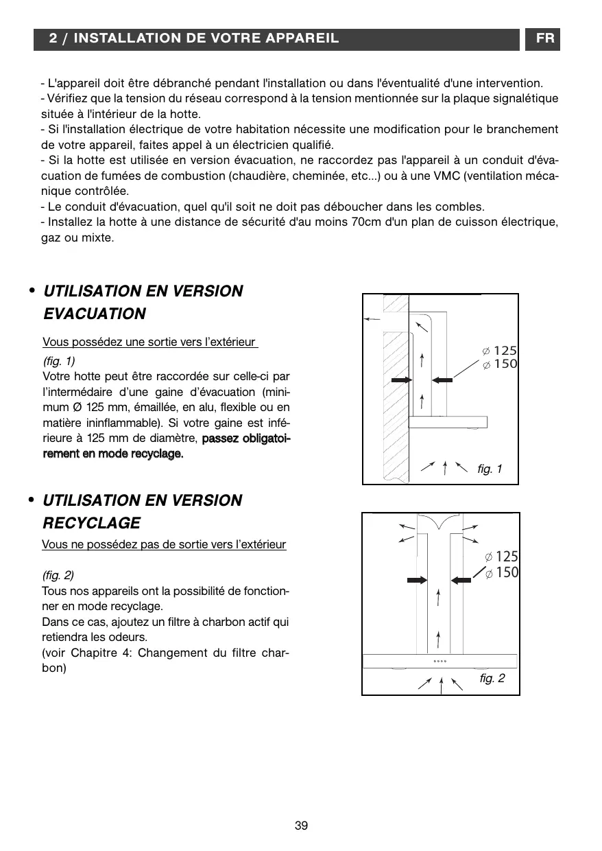 (fig. 1) Votre hotte peut être raccordée sur celle-ci par l’intermédaire d’une gaine d’évacuation (minimum Ø 125 mm, émaillée, en alu, flexible ou en matière ininflammable). Si votre gaine est inférieure à 125 mm de diamètre, passez obligatoirement en mode recyclage.