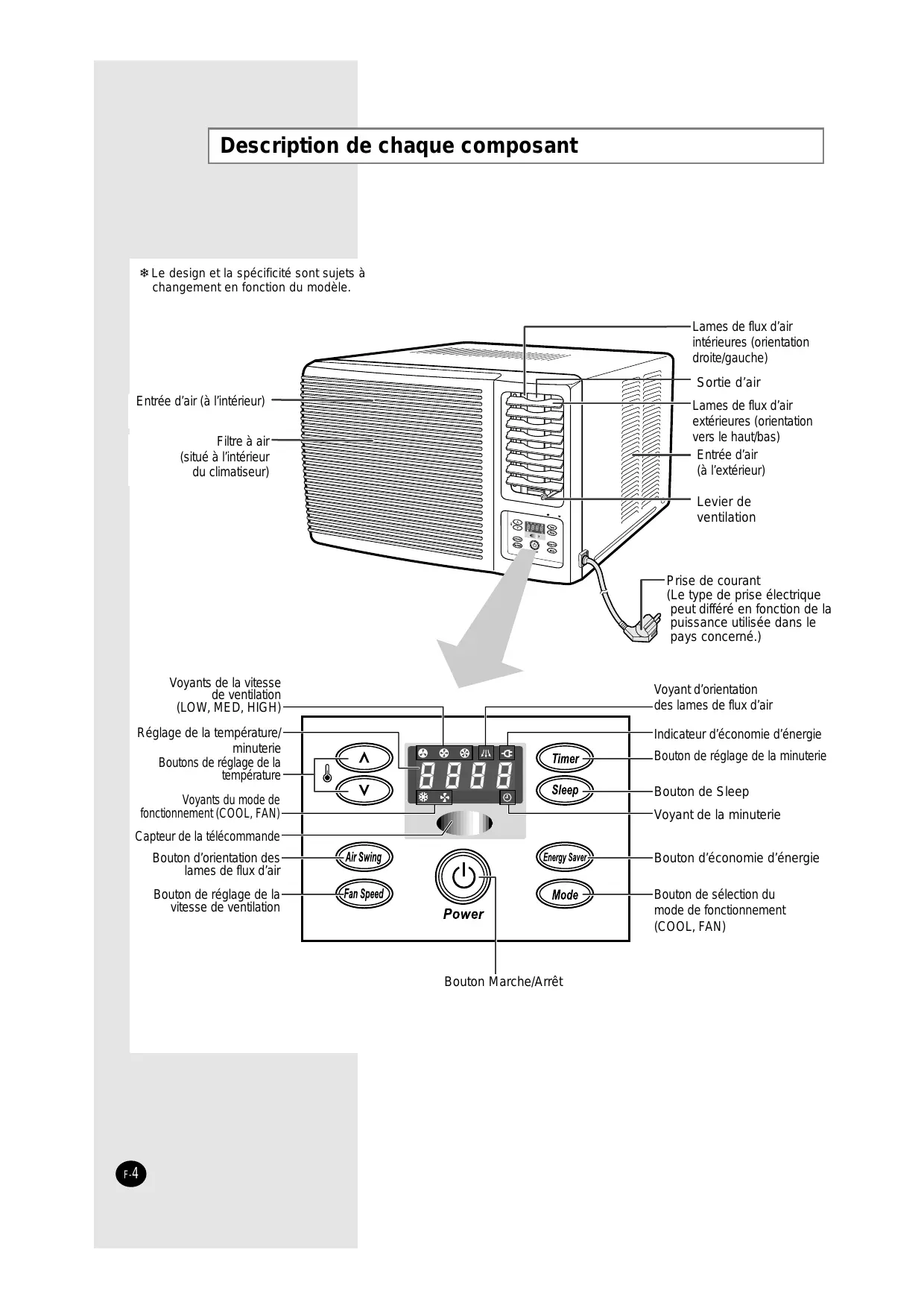 F-3 Description de chaque composant ❄ Le design et la spécificité sont sujets à changement en fonction du modèle. Lames de flux d’air intérieures (orientation droite/gauche) Sortie d’air Entrée d’air (à l’intérieur) Lames de flux d’air extérieures (orientation vers le haut/bas) Entrée d’air (à l’extérieur) Filtre à air (situé à l’intérieur du climatiseur) Levier de ventilation Prise de courant (Le type de prise électrique peut différé en fonction de la puissance utilisée dans le pays concerné.) Voyants de la vitesse de ventilation (LOW, MED, HIGH) Voyant d’orientation des lames de flux d’air Réglage de la température/ minuterie Boutons de réglage de la température Indicateur d’économie d’énergie Bouton de réglage de la minuterie Bouton de Sleep Voyants du mode de fonctionnement (COOL, FAN) Voyant de la minuterie Capteur de la télécommande Bouton d’orientation des lames de flux d’air Bouton d’économie d’énergie Bouton de réglage de la vitesse de ventilation Bouton de sélection du mode de fonctionnement (COOL, FAN) Bouton Marche/Arrêt F-4 Télécommande-Boutons Bouton de réglage de la minuterie Bouton de Sleep Timer Boutons de sélection du mode de fonctionnement Boutons de réglage de la température Boutons de réglage de la vitesse de ventilation Bouton d’économie d’énergie Bouton d’orientation des lames de flux d’air Bouton Marche/Arrêt F-5 Pour commencer Vous venez d’acquérir un climatiseur Samsung de type fenêtre qui doit être installé selon le mode d’emploi. Votre manuel contient les renseignements pratiques pour l’utilisation de votre climatiseur. Veuillez lire les directives trouvées dans le présent manuel pour profiter complètement de toutes les caractéristiques de votre appareil. Le manuel est organisé comme suit. ◆ Les figures des pages 4 et 5 illustrent : - une description de chaque composant - les boutons la télécommande. Ces figures vous aideront à repérer les boutons et à comprendre les symboles affichés. ◆ La partie principale du document contient une série de procédures par étapes expliquant les différentes fonctions de l’appareil. Les illustrations des procédures utilisent les quatre symboles suivants: APPUYER SUR F-6 PRESSER