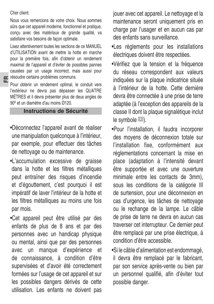 Nous vous remercions de votre choix. Nous sommes sûrs que cet appareil moderne, fonctionnel et pratique, conçu avec des matériaux de grande qualité, va satisfaire vos besoins de façon optimale. Lisez attentivement toutes les sections de ce MANUEL d’UTILISATION avant de mettre la hotte en marche pour la première fois, afin d’obtenir un rendement maximal de l’appareil et d’éviter de possibles pannes causées par un usage incorrect, mais aussi pour résoudre certains problèmes communs. Pour obtenir un rendement optimal, le conduit vers l’extérieur ne devra pas dépasser les QUATRE MÈTRES et il devra présenter plus de deux angles de 90º et un diamètre d’au moins Ø120.