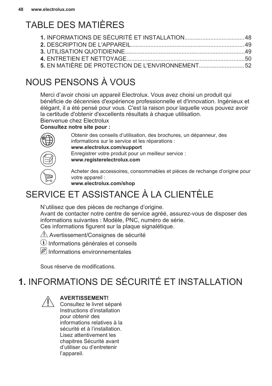 NOUS PENSONS À VOUS Merci d’avoir choisi un appareil Electrolux. Vous avez choisi un produit qui bénéficie de décennies d'expérience professionnelle et d'innovation. Ingénieux et élégant, il a été pensé pour vous. C'est la raison pour laquelle vous pouvez avoir la certitude d'obtenir d'excellents résultats à chaque utilisation. Bienvenue chez Electrolux Consultez notre site pour :