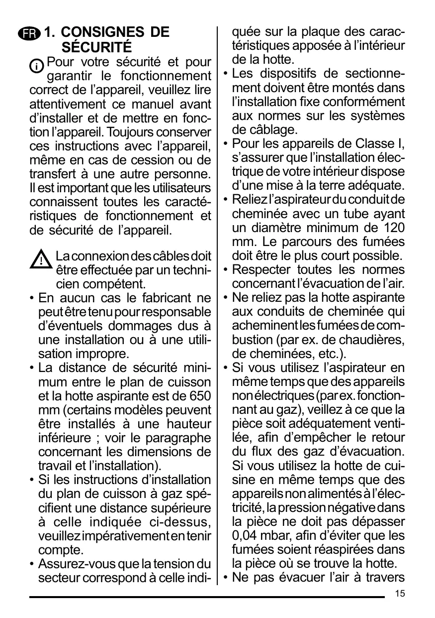 Les dispositifs de sectionnement doivent être montés dans l’installation fixe conformément aux normes sur les systèmes de câblage. Pour les appareils de Classe I, s’assurer que l’installation électrique de votre intérieur dispose d’une mise à la terre adéquate. Reliez l’aspirateur du conduit de cheminée avec un tube ayant un diamètre minimum de 120 mm. Le parcours des fumées doit être le plus court possible. Respecter toutes les normes concernant l’évacuation de l’air. Ne reliez pas la hotte aspirante aux conduits de cheminée qui acheminent les fumées de combustion (par ex. de chaudières, de cheminées, etc.). Si vous utilisez l’aspirateur en même temps que des appareils non électriques (par ex. fonctionnant au gaz), veillez à ce que la pièce soit adéquatement ventilée, afin d’empêcher le retour du flux des gaz d’évacuation. Si vous utilisez la hotte de cuisine en même temps que des appareils non alimentés à l’électricité, la pression négative dans la pièce ne doit pas dépasser 0,04 mbar, afin d’éviter que les fumées soient réaspirées dans la pièce où se trouve la hotte. Ne pas évacuer l’air à travers 15