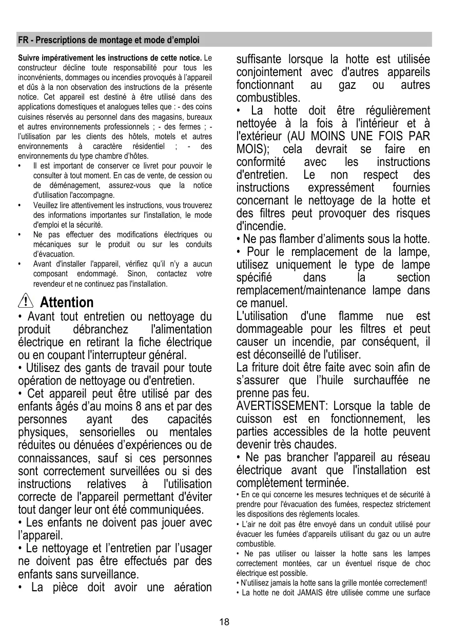 La hotte doit être régulièrement nettoyée à la fois à l'intérieur et à l'extérieur (AU MOINS UNE FOIS PAR MOIS); cela devrait se faire en conformité avec les instructions d'entretien. Le non respect des instructions expressément fournies concernant le nettoyage de la hotte et des filtres peut provoquer des risques d'incendie.