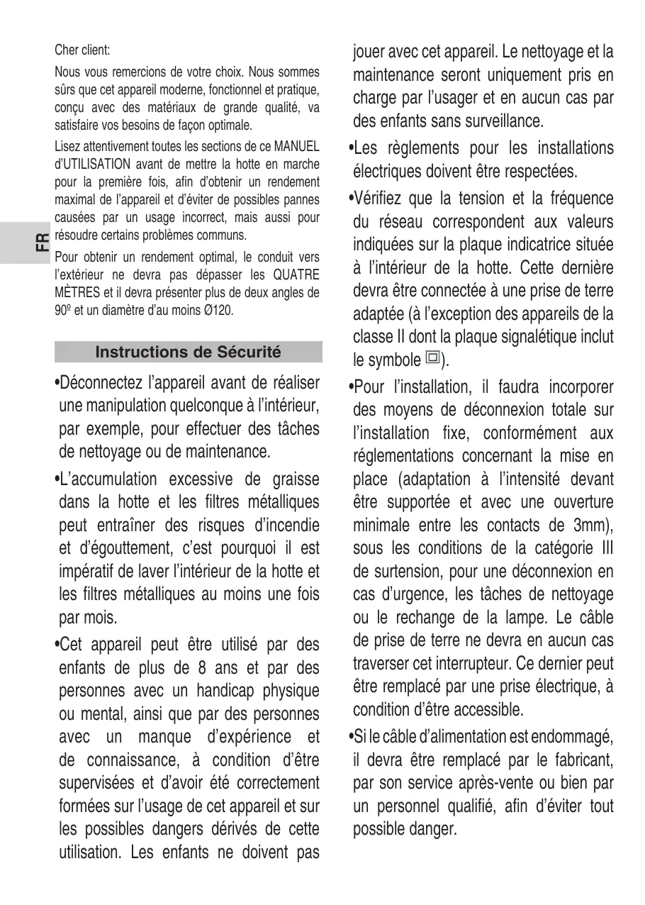•Votre hotte est destinée à un usage domestique et uniquement pour l’extraction et la purification des gaz en provenance de la préparation d’aliments. Une utilisation différente pourrait être dangereuse et vous en serez totalement responsable.