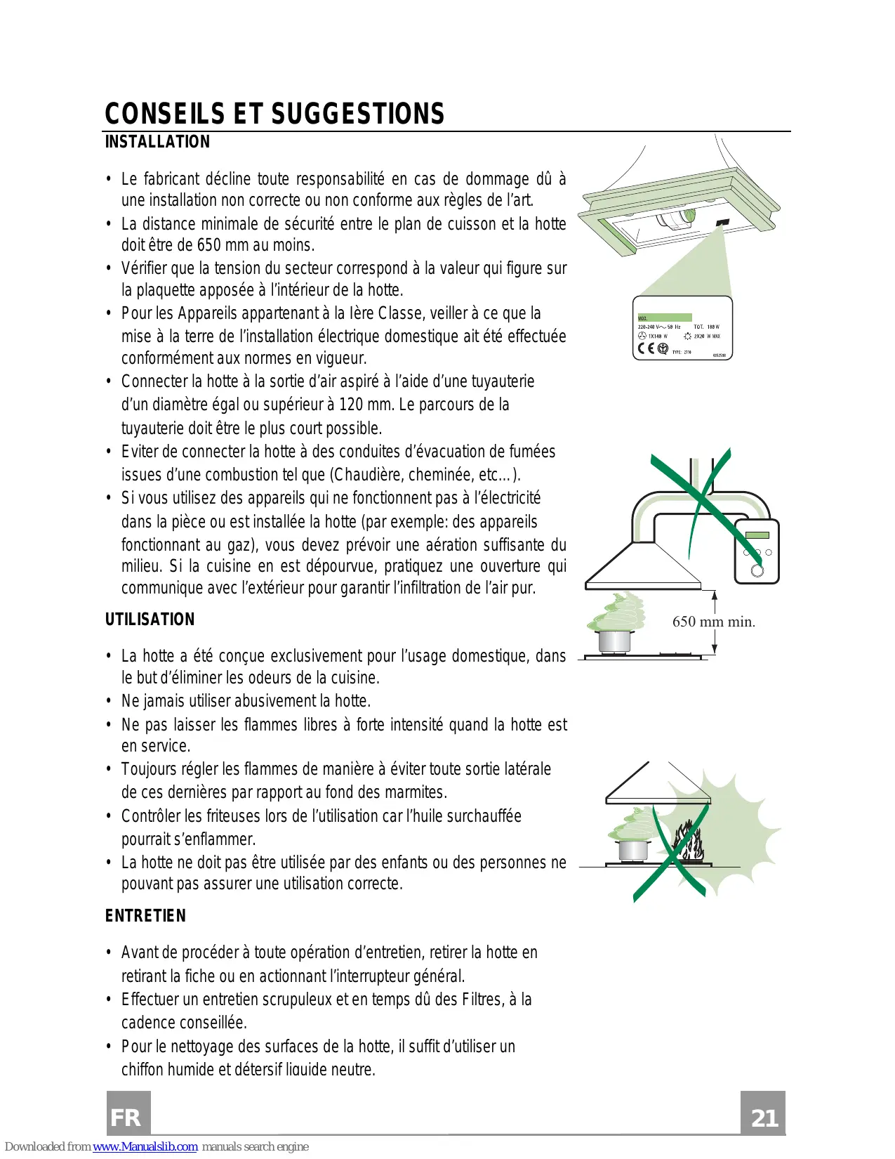 • Ne pas laisser les flammes libres à forte intensité quand la hotte est en service. • Toujours régler les flammes de manière à éviter toute sortie latérale de ces dernières par rapport au fond des marmites. • Contrôler les friteuses lors de l’utilisation car l’huile surchauffée pourrait s’enflammer. • La hotte ne doit pas être utilisée par des enfants ou des personnes ne pouvant pas assurer une utilisation correcte. ENTRETIEN • Avant de procéder à toute opération d’entretien, retirer la hotte en retirant la fiche ou en actionnant l’interrupteur général. • Effectuer un entretien scrupuleux et en temps dû des Filtres, à la cadence conseillée. • Pour le nettoyage des surfaces de la hotte, il suffit d’utiliser un chiffon humide et détersif liquide neutre.