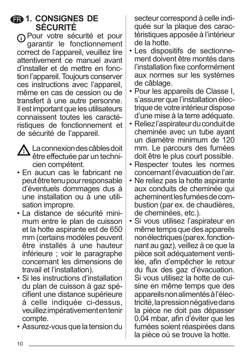 Les dispositifs de sectionnement doivent être montés dans l’installation fixe conformément aux normes sur les systèmes de câblage. Pour les appareils de Classe I, s’assurer que l’installation électrique de votre intérieur dispose d’une mise à la terre adéquate. Reliez l’aspirateur du conduit de cheminée avec un tube ayant un diamètre minimum de 120 mm. Le parcours des fumées doit être le plus court possible. Respecter toutes les normes concernant l’évacuation de l’air. Ne reliez pas la hotte aspirante aux conduits de cheminée qui acheminent les fumées de combustion (par ex. de chaudières, de cheminées, etc.). Si vous utilisez l’aspirateur en même temps que des appareils non électriques (par ex. fonctionnant au gaz), veillez à ce que la pièce soit adéquatement ventilée, afin d’empêcher le retour du flux des gaz d’évacuation. Si vous utilisez la hotte de cuisine en même temps que des appareils non alimentés à l’électricité, la pression négative dans la pièce ne doit pas dépasser 0,04 mbar, afin d’éviter que les fumées soient réaspirées dans la pièce où se trouve la hotte.