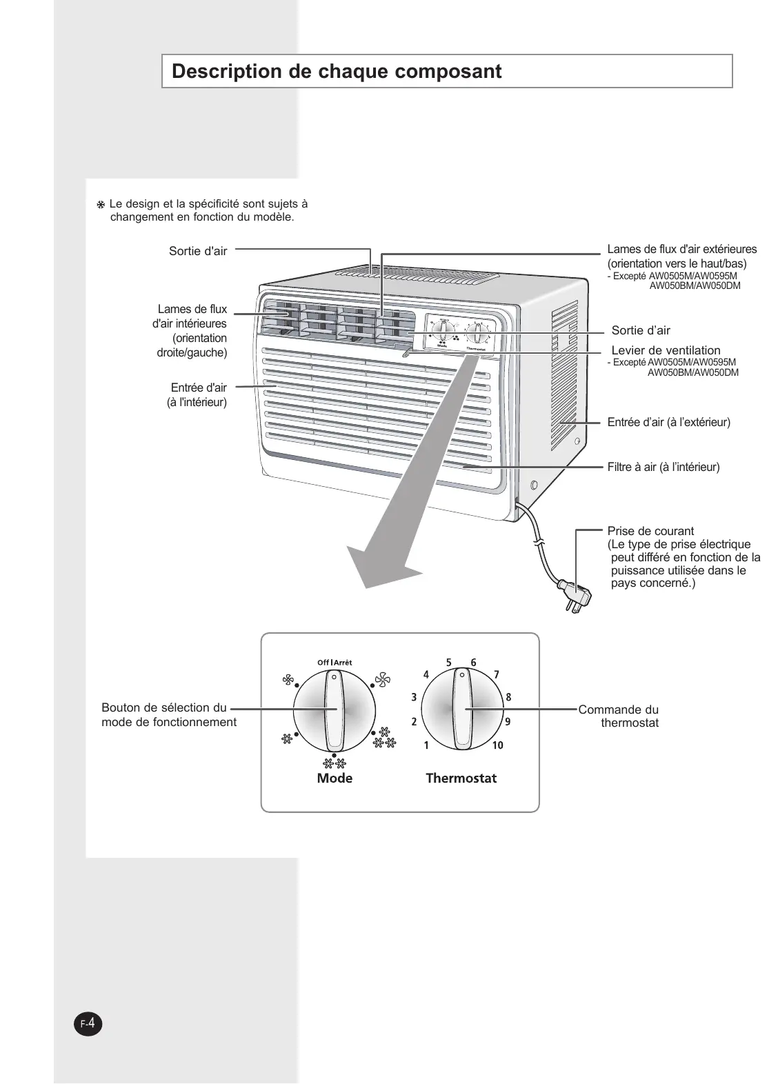 F- 3 Description de chaque composant Le design et la spécificité sont sujets à changement en fonction du modèle. Sortie d'air Lames de flux d'air extérieures (orientation vers le haut/bas) - Excepté AW0505M/AW0595M AW050BM/AW050DM Lames de flux d'air intérieures (orientation droite/gauche) Sortie d’air Levier de ventilation - Excepté AW0505M/AW0595M AW050BM/AW050DM Entrée d'air (à l'intérieur) Entrée d’air (à l’extérieur) Filtre à air (à l’intérieur) Prise de courant (Le type de prise électrique peut différé en fonction de la puissance utilisée dans le pays concerné.) Bouton de sélection du mode de fonctionnement F- 4 Commande du thermostat Pour commencer Vous venez d’acquérir un climatiseur Samsung de type fenêtre qui doit être installé selon le mode d’emploi. Votre manuel contient les renseignements pratiques pour l’utilisation de votre climatiseur. Veuillez lire les directives trouvées dans le présent manuel pour profiter complètement de toutes les caractéristiques de votre appareil. Les illustrations des procédures utilisent les quatre symboles suivants: APPUYER SUR PRESSER