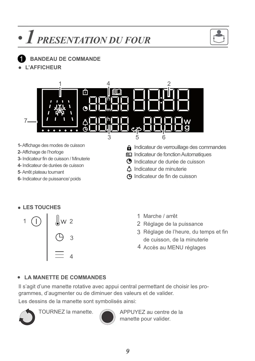 Il s’agit d’une manette rotative avec appui central permettant de choisir les programmes, d’augmenter ou de diminuer des valeurs et de valider. Les dessins de la manette sont symbolisés ainsi: TOURNEZ la manette. APPUYEZ au centre de la manette pour valider.