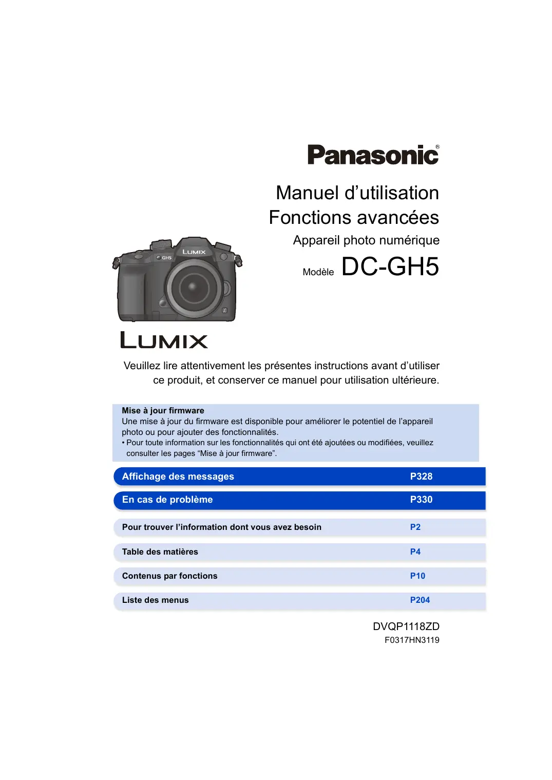 Manuel d’utilisation Fonctions avancées Appareil photo numérique Modèle DC-GH5 Veuillez lire attentivement les présentes instructions avant d’utiliser ce produit, et conserver ce manuel pour utilisation ultérieure. Mise à jour firmware Une mise à jour du firmware est disponible pour améliorer le potentiel de l’appareil photo ou pour ajouter des fonctionnalités.