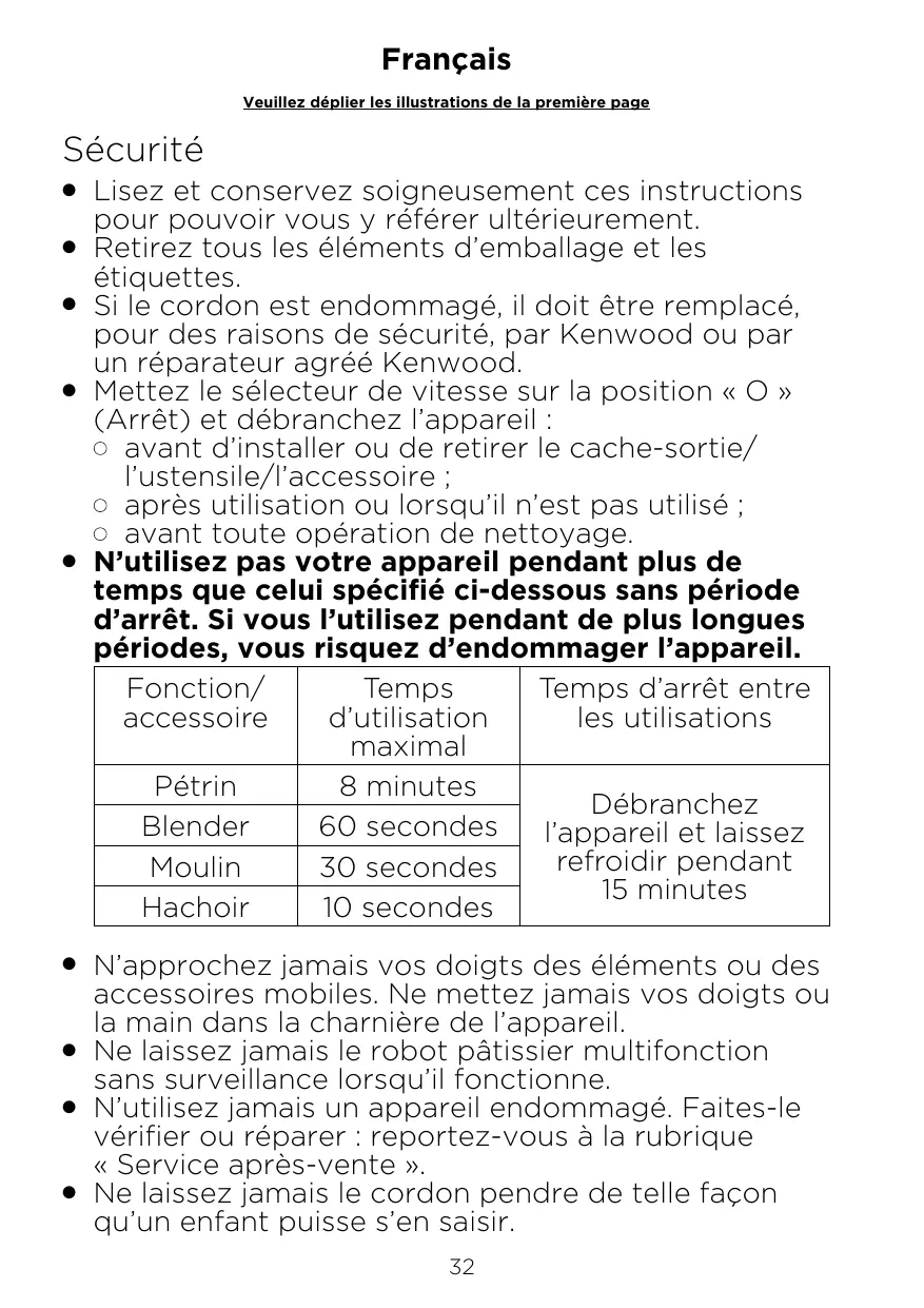 Lisez et conservez soigneusement ces instructions pour pouvoir vous y référer ultérieurement. O Retirez tous les éléments d’emballage et les étiquettes. O Si le cordon est endommagé, il doit être remplacé, pour des raisons de sécurité, par Kenwood ou par un réparateur agréé Kenwood. O Mettez le sélecteur de vitesse sur la position « O » (Arrêt) et débranchez l’appareil : avant d’installer ou de retirer le cache-sortie/ l’ustensile/l’accessoire ; après utilisation ou lorsqu’il n’est pas utilisé ; avant toute opération de nettoyage. O N’utilisez pas votre appareil pendant plus de temps que celui spécifié ci-dessous sans période d’arrêt. Si vous l’utilisez pendant de plus longues périodes, vous risquez d’endommager l’appareil. Fonction/ Temps Temps d’arrêt entre accessoire d’utilisation les utilisations maximal Pétrin 8 minutes Débranchez Blender 60 secondes l’appareil et laissez refroidir pendant Moulin 30 secondes 15 minutes Hachoir 10 secondes