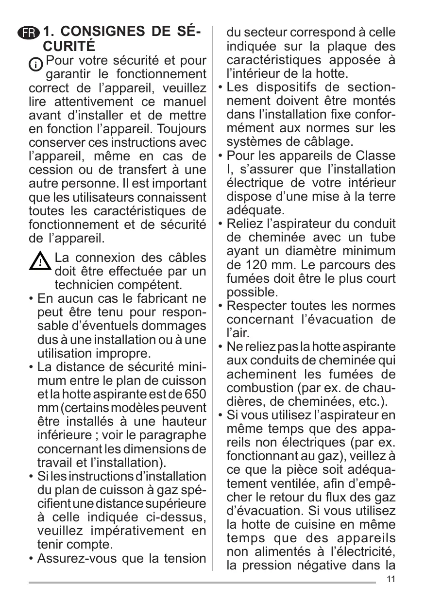 • En aucun cas le fabricant ne peut être tenu pour responsable d’éventuels dommages dus à une installation ou à une utilisation impropre. • La distance de sécurité minimum entre le plan de cuisson et la hotte aspirante est de 650 mm (certains modèles peuvent être installés à une hauteur inférieure ; voir le paragraphe concernant les dimensions de travail et l’installation). • Si les instructions d’installation du plan de cuisson à gaz spécifient une distance supérieure à celle indiquée ci-dessus, veuillez impérativement en tenir compte. • Assurez-vous que la tension