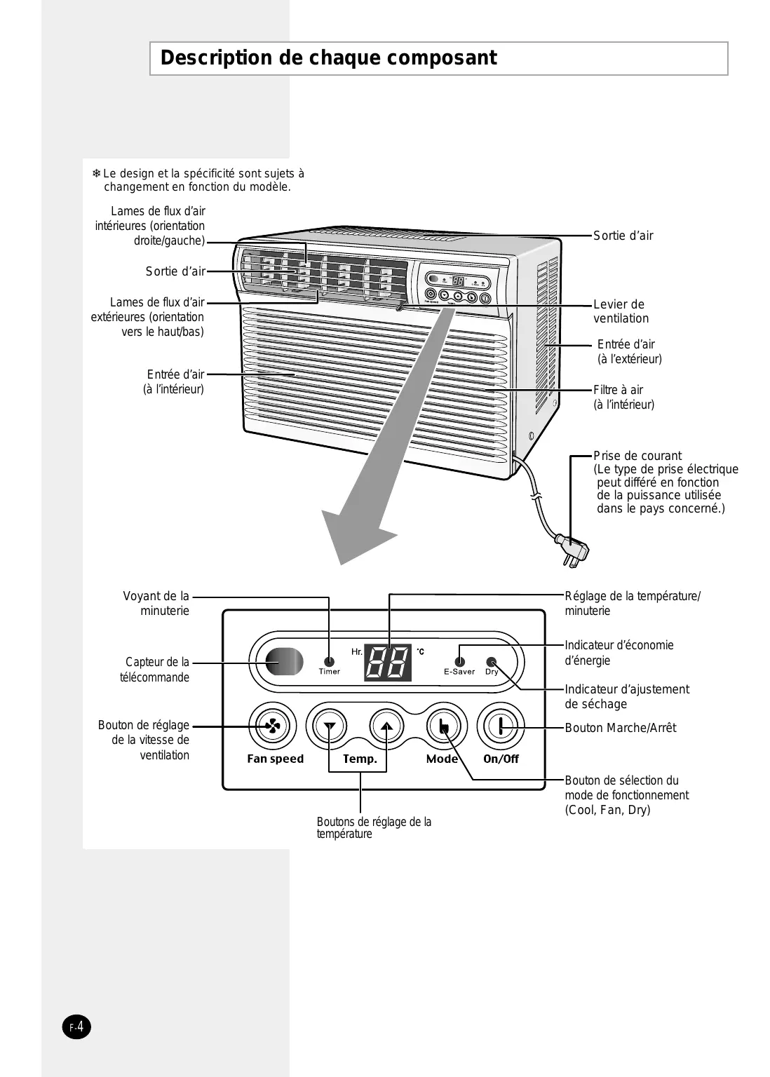 F-3 Description de chaque composant ❄ Le design et la spécificité sont sujets à changement en fonction du modèle. Lames de flux d’air intérieures (orientation droite/gauche) Sortie d’air Sortie d’air Lames de flux d’air extérieures (orientation vers le haut/bas) Levier de ventilation Entrée d’air (à l’extérieur) Entrée d’air (à l’intérieur) Filtre à air (à l’intérieur) Prise de courant (Le type de prise électrique peut différé en fonction de la puissance utilisée dans le pays concerné.) Voyant de la minuterie Réglage de la température/ minuterie Indicateur d’économie d’énergie Capteur de la télécommande Indicateur d’ajustement de séchage Bouton de réglage de la vitesse de ventilation Bouton Marche/Arrêt Bouton de sélection du mode de fonctionnement (Cool, Fan, Dry) Boutons de réglage de la température F-4 Télécommande - Boutons et affichage Voyant de transmission de la télécommande Mode de fonctionnement Refroidissement, Déshumidification, Ventilation) Réglage de la température Mode Sleep Bouton de sélection du mode de founctionnement (Cool, Fan, Dry) Bouton de réglage de la température Bouton de Sleep Economisation d’énergie Affichage de la vitesse du ventilateur Réglage de la minuterie de mise en marche Réglage de la minuterie d’arrêt Indicateur d’usure des piles Bouton de réglage de la vitesse du ventilation Bouton d’économie d’énergie Bouton de réglage de la minuterie Programmation et annulation de la minuterie Bouton Marche/Arrêt F-5 Pour commencer Vous venez d’acquérir un climatiseur Samsung de type fenêtre qui doit être installé selon le mode d’emploi. Votre manuel contient les renseignements pratiques pour l’utilisation de votre climatiseur. Veuillez lire les directives trouvées dans le présent manuel pour profiter complètement de toutes les caractéristiques de votre appareil. Le manuel est organisé comme suit. ◆ Les figures des pages 4 et 5 illustrent : - une description de chaque composant - les boutons et l’afficheur de la télécommande. Ces figures vous aideront à repérer les boutons et à comprendre les symboles affichés. ◆ La partie principale du document contient une série de procédures par étapes expliquant les différentes fonctions de l’appareil. Les illustrations des procédures utilisent les quatre symboles suivants: APPUYER SUR F-6 PRESSER