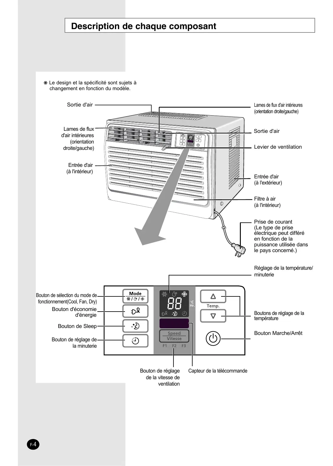 F- 3 Description de chaque composant Le design et la spécificité sont sujets à changement en fonction du modèle. Sortie d'air Lames de flux d'air intérieures (orientation droite/gauche) Lames de flux d'air intérieures (orientation droite/gauche) Sortie d'air Levier de ventilation Entrée d'air (à l'intérieur) Entrée d'air (à l'extérieur) Filtre à air (à l'intérieur) Prise de courant (Le type de prise électrique peut différé en fonction de la puissance utilisée dans le pays concerné.) Réglage de la température/ minuterie Bouton de sélection du mode de fonctionnement(Cool, Fan, Dry) Bouton d'économie d'énergie Boutons de réglage de la température Bouton de Sleep Bouton Marche/Arrêt Bouton de réglage de la minuterie Bouton de réglage de la vitesse de ventilation F- 4 Capteur de la télécommande Télécommande-Boutons Bouton de réglage de la minuterie Bouton de Sleep Timer Boutons de réglage de la température Boutons de sélection du mode de fonctionnement Boutons de réglage de la vitesse de ventilation Bouton d'économie d'énergie Bouton Marche/Arrêt F-5 Pour commencer Votre manuel contient les renseignements pratiques pour l'utilisation de votre climatiseur . Veuillez lire les directives trouvées dans le présent manuel pour profiter complètement de toutes les caractéristiques de votre appareil. Le manuel est organisé comme suit. Les figures des pages 4 et 5 illustrent : - une description de chaque composant - les boutons la télécommande. Ces figures vous aideront à repérer les boutons et à comprendre les symboles affichés. La partie principale du document contient une série de procédures par étapes expliquant les différentes fonctions de l'appareil. Les illustrations des procédures utilisent les quatre symboles suivants: APPUYER SUR F- 6 PRESSER IMPORTANT NOTE Insérer les piles dans la télécommande Vous devez insérer ou remplacer les piles de la télécommande lorsque : vous venez d'acheter le climatiseur. la télécommande ne fonctionne plus correctement. Utiliser deux piles “AAA” LR03 de 1,5V. Ne jamais utiliser de piles anciennes ou de piles de marques différentes ensemble. Les piles risquent de se décharger complètement après un an, même si elles n'ont pas été utilisées.