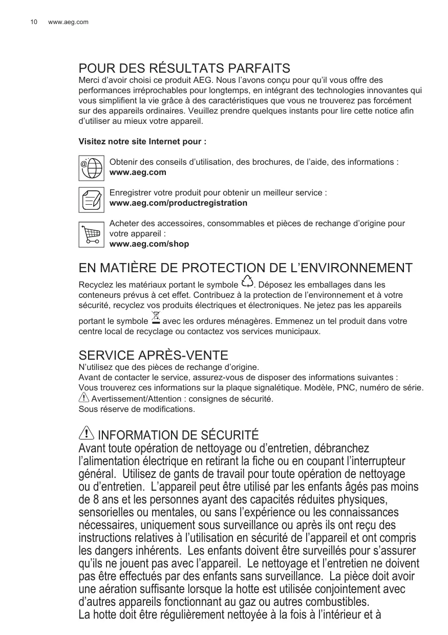 Merci d’avoir choisi ce produit AEG. Nous l’avons conçu pour qu’il vous offre des performances irréprochables pour longtemps, en intégrant des technologies innovantes qui vous simplifient la vie grâce à des caractéristiques que vous ne trouverez pas forcément sur des appareils ordinaires. Veuillez prendre quelques instants pour lire cette notice afin d’utiliser au mieux votre appareil. Visitez notre site Internet pour : Obtenir des conseils d’utilisation, des brochures, de l’aide, des informations : www.aeg.com Enregistrer votre produit pour obtenir un meilleur service : www.aeg.com/productregistration Acheter des accessoires, consommables et pièces de rechange d’origine pour votre appareil : www.aeg.com/shop EN MATIÈRE DE PROTECTION DE L’ENVIRONNEMENT Recyclez les matériaux portant le symbole . Déposez les emballages dans les conteneurs prévus à cet effet. Contribuez à la protection de l’environnement et à votre sécurité, recyclez vos produits électriques et électroniques. Ne jetez pas les appareils portant le symbole avec les ordures ménagères. Emmenez un tel produit dans votre centre local de recyclage ou contactez vos services municipaux. N’utilisez que des pièces de rechange d’origine. Avant de contacter le service, assurez-vous de disposer des informations suivantes : Vous trouverez ces informations sur la plaque signalétique. Modèle, PNC, numéro de série. Avertissement/Attention : consignes de sécurité. Sous réserve de modifications.