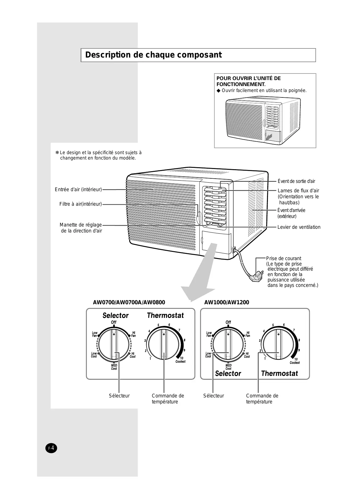 FONCTIONNEMENT. ◆ Ouvrir facilement en utilisant la poignée. ❄ Le design et la spécificité sont sujets à changement en fonction du modèle. Évent de sortie d'air Entrée d’air (intérieur) Lames de flux d’air (Orientation vers le haut/bas) Filtre à air(intérieur) Évent d'arrivée (extérieur) Manette de réglage de la direction d'air Levier de ventilation Prise de courant (Le type de prise électrique peut différé en fonction de la puissance utilisée dans le pays concerné.) AW0700/AW0700A/AW0800 Sélecteur F-4 Commande de température AW1000/AW1200 Sélecteur Commande de température Pour commencer Vous venez d’acquérir un climatiseur Samsung de type fenêtre qui doit être installé selon le mode d’emploi. Votre manuel contient les renseignements pratique pour l’utilisation de votre climatiseur. Veuillez lire les directives trouvées dans le manuel pour profiter complètement de toutes les caractéristiques de votre appareil. F-5 Pour refroidir la pièce Vous devez tourner le bouton de commande à la position COOL pour régler: ◆ La température de refroidissement ◆ La vitesse du ventilateur durant le refroidissement