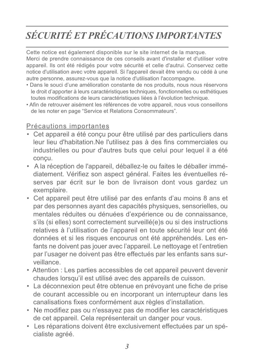 • Cet appareil a été conçu pour être utilisé par des particuliers dans leur lieu d'habitation.Ne l'utilisez pas à des fins commerciales ou industrielles ou pour d'autres buts que celui pour lequel il a été conçu. • A la réception de l'appareil, déballez-le ou faites le déballer immédiatement. Vérifiez son aspect général. Faites les éventuelles réserves par écrit sur le bon de livraison dont vous gardez un exemplaire. • Cet appareil peut être utilisé par des enfants d’au moins 8 ans et par des personnes ayant des capacités physiques, sensorielles, ou mentales réduites ou dénuées d’expérience ou de connaissance, s’ils (si elles) sont correctement surveillé(e)s ou si des instructions relatives à l’utilisation de l’appareil en toute sécurité leur ont été données et si les risques encourus ont été appréhendés. Les enfants ne doivent pas jouer avec l’appareil. Le nettoyage et l’entretien par l’usager ne doivent pas être effectués par les enfants sans surveillance. • Attention : Les parties accessibles de cet appareil peuvent devenir chaudes lorsqu’il est utilisé avec des appareils de cuisson. • La déconnexion peut être obtenue en prévoyant une fiche de prise de courant accessible ou en incorporant un interrupteur dans les canalisations fixes conformément aux règles d’installation. • Ne modifiez pas ou n'essayez pas de modifier les caractéristiques de cet appareil. Cela représenterait un danger pour vous. • Les réparations doivent être exclusivement effectuées par un spécialiste agréé.