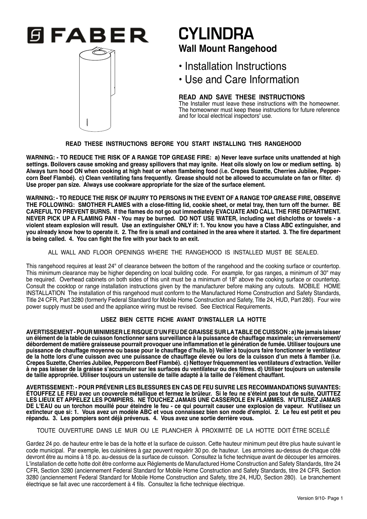 AVERTISSEMENT: - POUR PRÉVENIR LES BLESSURES EN CAS DE FEU SUIVRE LES RECOMMANDATIONS SUIVANTES: ÉTOUFFEZ LE FEU avec un couvercle métallique et fermez le brûleur. Si le feu ne s'éteint pas tout de suite, QUITTEZ LES LIEUX ET APPELEZ LES POMPIERS. NE TOUCHEZ JAMAIS UNE CASSEROLE EN FLAMMES. N'UTILISEZ JAMAIS DE L'EAU ou un torchon mouillé pour éteindre le feu - ce qui pourrait causer une explosion de vapeur. N'utilisez un extincteur que si: 1. Vous avez un modèle ABC et vous connaissez bien son mode d'emploi. 2. Le feu est petit et peu répandu. 3. Les pompiers sont déjà prévenus. 4. Vous avez une sortie derrière vous. TOUTE OUVERTURE DANS LE MUR OU LE PLANCHER À PROXIMITÉ DE LA HOTTE DOIT ÊTRE SCELLÉ Gardez 24 po. de hauteur entre le bas de la hotte et la surface de cuisson. Cette hauteur minimum peut être plus haute suivant le code municipal. Par exemple, les cuisinières à gaz peuvent requérir 30 po. de hauteur. Les armoires au-dessus de chaque côté devront être au moins à 18 po. au-dessus de la surface de cuisson. Consultez la fiche technique avant de découper les armoires. L'installation de cette hotte doit être conforme aux Réglements de Manufactured Home Construction and Safety Standards, titre 24 CFR, Section 3280 (anciennement Federal Standard for Mobile Home Construction and Safety Standards, titre 24 CFR, Section 3280 (anciennement Federal Standard for Mobile Home Construction and Safety, titre 24, HUD, Section 280). Le branchement électrique se fait avec une raccordement à 4 fils. Consultez la fiche technique électrique. Version 9/10- Page 1 Un tuyau flexible égale deux fois plus qu'un tuyau rigide, ce qui réduit la puissance d'évacuation. Veillez à ce que l'espace pour le tuyau soit ample - ainsi on n'aurait pas besoin de découper les supports de mur intérieur. Si ce découpage est nécessaire, veillez bien à ce qu'un renforcement soit mis en place.