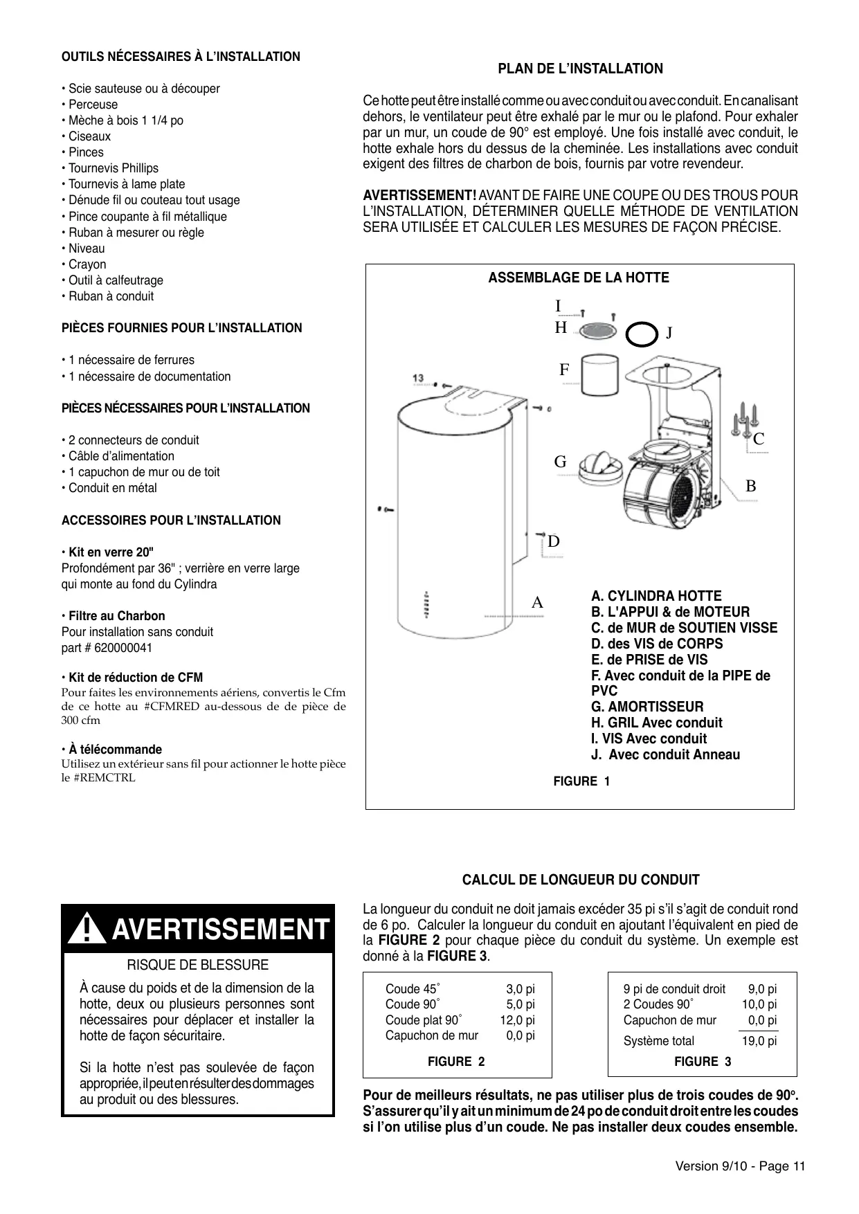 À cause du poids et de la dimension de la hotte, deux ou plusieurs personnes sont nécessaires pour déplacer et installer la hotte de façon sécuritaire. Si la hotte n’est pas soulevée de façon appropriée, il peut en résulter des dommages au produit ou des blessures. La longueur du conduit ne doit jamais excéder 35 pi s’il s’agit de conduit rond de 6 po. Calculer la longueur du conduit en ajoutant l’équivalent en pied de la figure 2 pour chaque pièce du conduit du système. Un exemple est donné à la figure 3. Coude 45˚ Coude 90˚ Coude plat 90˚ Capuchon de mur FIGURE 2 3,0 pi 5,0 pi 12,0 pi 0,0 pi 9 pi de conduit droit 2 Coudes 90˚ Capuchon de mur Système total FIGURE 3 9,0 pi 10,0 pi 0,0 pi 19,0 pi Pour de meilleurs résultats, ne pas utiliser plus de trois coudes de 90o. S’assurer qu’il y ait un minimum de 24 po de conduit droit entre les coudes si l’on utilise plus d’un coude. Ne pas installer deux coudes ensemble. Version 9/10 - Page 11