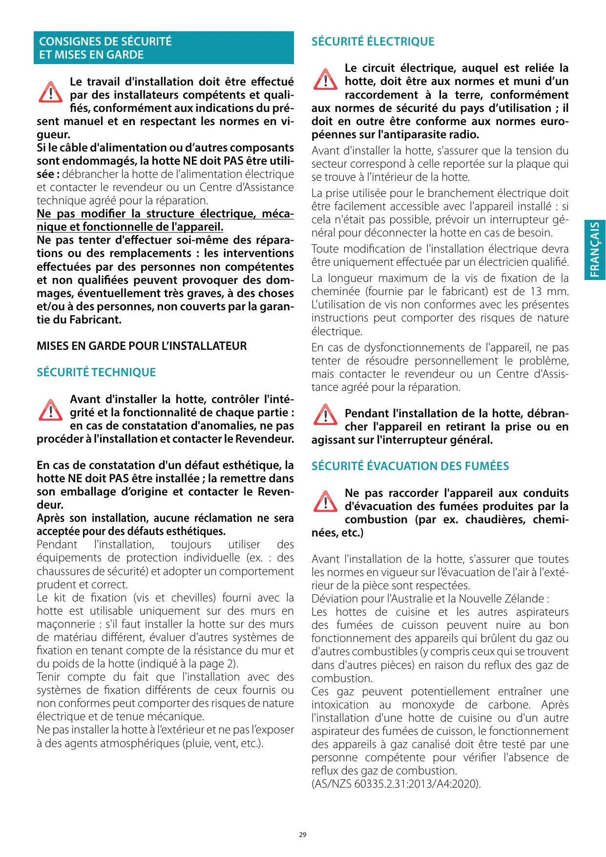 Avant l'installation de la hotte, s'assurer que toutes les normes en vigueur sur l’évacuation de l'air à l'extérieur de la pièce sont respectées. Déviation pour l'Australie et la Nouvelle Zélande : Les hottes de cuisine et les autres aspirateurs des fumées de cuisson peuvent nuire au bon fonctionnement des appareils qui brûlent du gaz ou d'autres combustibles (y compris ceux qui se trouvent dans d'autres pièces) en raison du reflux des gaz de combustion. Ces gaz peuvent potentiellement entraîner une intoxication au monoxyde de carbone. Après l'installation d'une hotte de cuisine ou d'un autre aspirateur des fumées de cuisson, le fonctionnement des appareils à gaz canalisé doit être testé par une personne compétente pour vérifier l'absence de reflux des gaz de combustion. (AS/NZS 60335.2.31:2013/A4:2020).