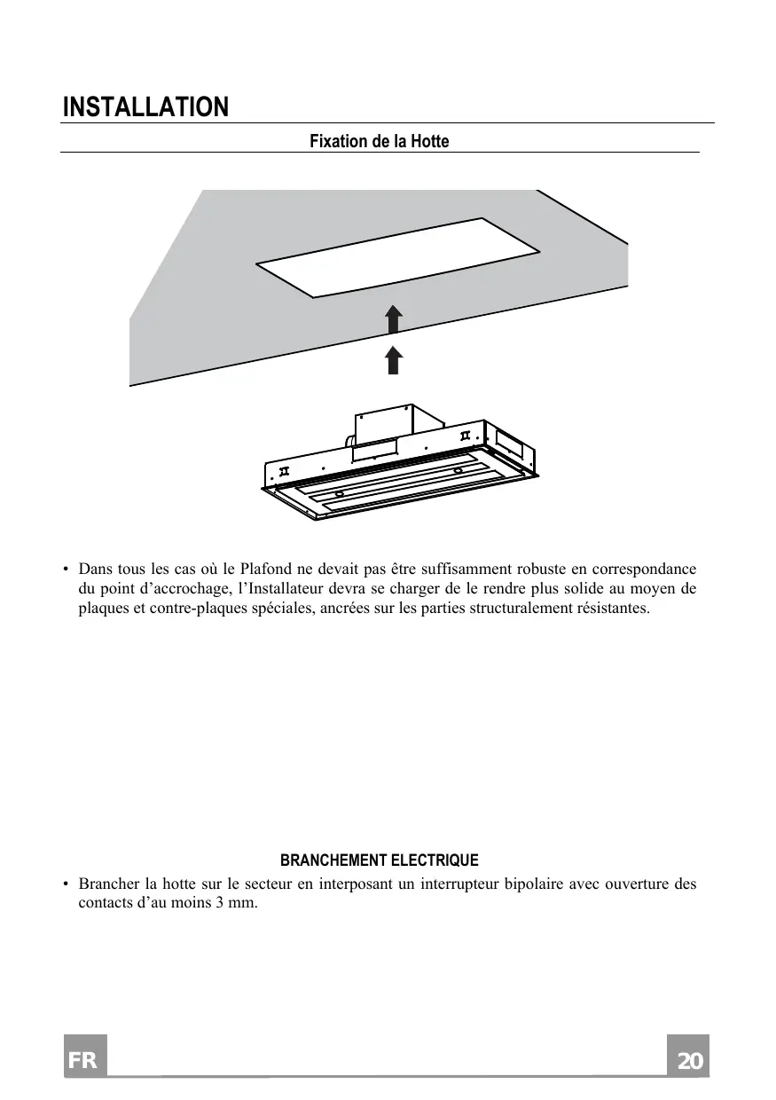 - Brancher la hotte sur le secteur en interposant un interrupteur bipolaire avec ouverture des contacts d’au moins 3 mm.
