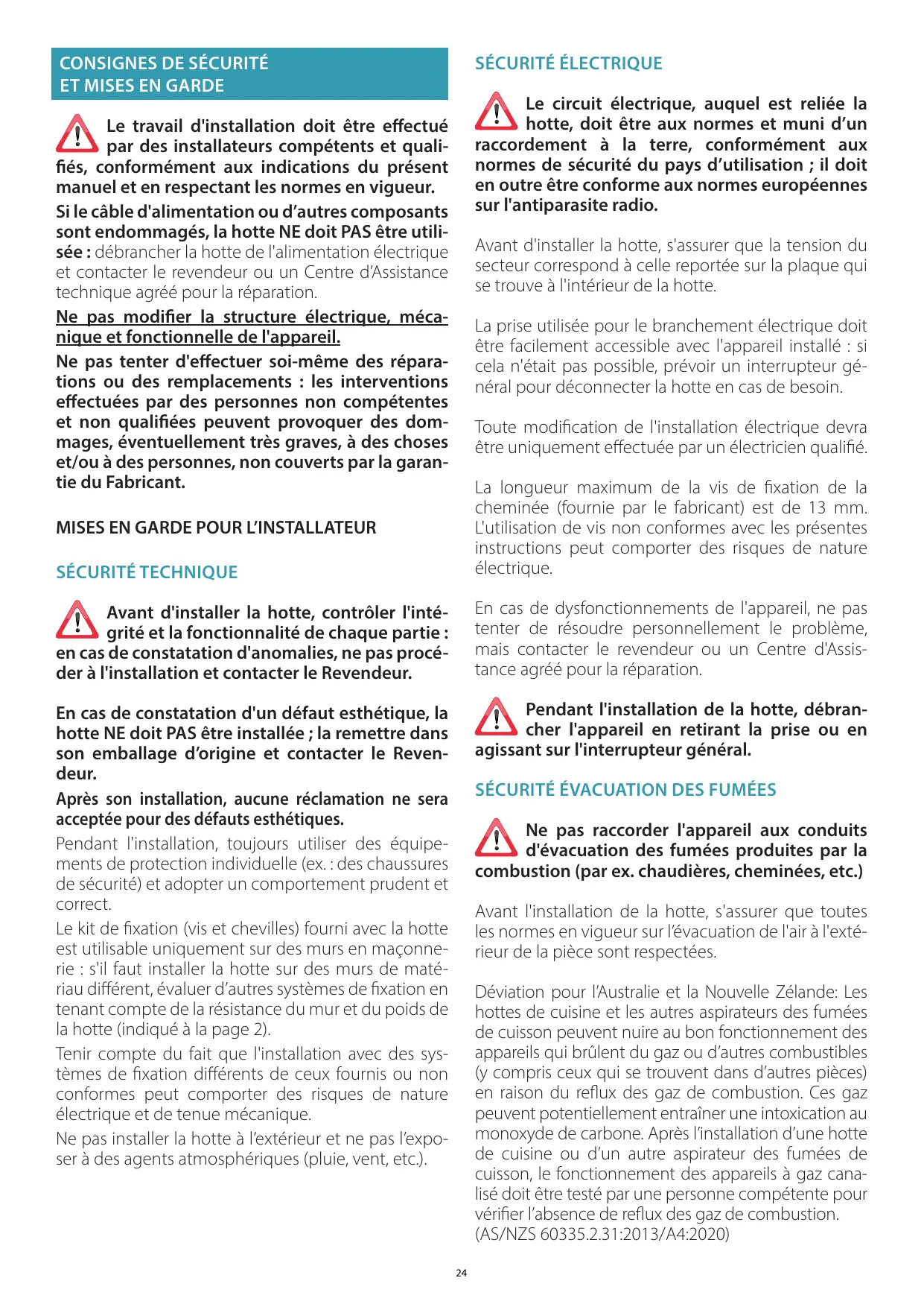 Avant l'installation de la hotte, s'assurer que toutes les normes en vigueur sur l’évacuation de l'air à l'extérieur de la pièce sont respectées. Déviation pour l’Australie et la Nouvelle Zélande: Les hottes de cuisine et les autres aspirateurs des fumées de cuisson peuvent nuire au bon fonctionnement des appareils qui brûlent du gaz ou d’autres combustibles (y compris ceux qui se trouvent dans d’autres pièces) en raison du reflux des gaz de combustion. Ces gaz peuvent potentiellement entraîner une intoxication au monoxyde de carbone. Après l’installation d’une hotte de cuisine ou d’un autre aspirateur des fumées de cuisson, le fonctionnement des appareils à gaz canalisé doit être testé par une personne compétente pour vérifier l’absence de reflux des gaz de combustion. (AS/NZS 60335.2.31:2013/A4:2020) 24