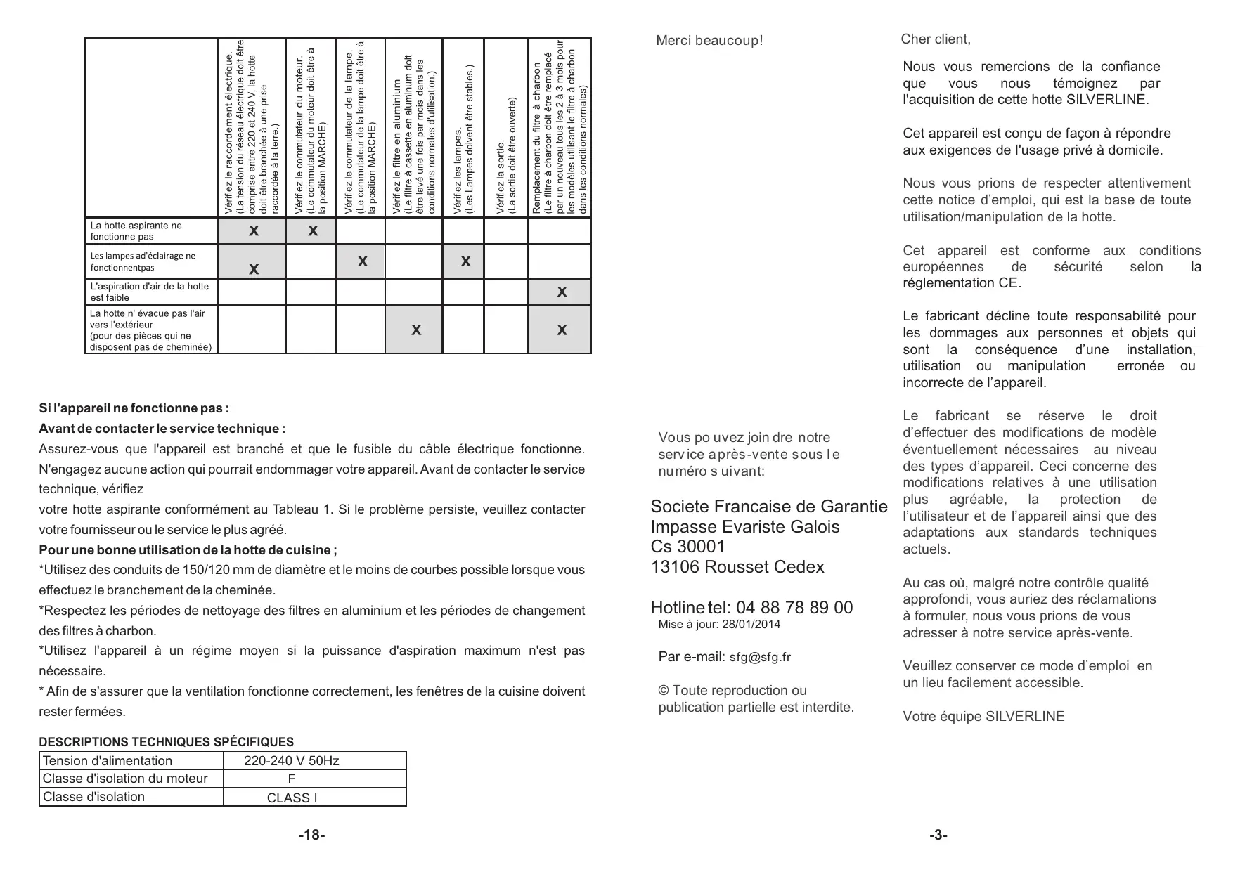 Merci beaucoup! Cher client, Nous vous remercions de la confiance que vous nous témoignez par l'acquisition de cette hotte SILVERLINE. Cet appareil est conçu de façon à répondre aux exigences de l'usage privé à domicile. Nous vous prions de respecter attentivement cette notice d’emploi, qui est la base de toute utilisation/manipulation de la hotte. Cet appareil est conforme aux conditions européennes sécurité selon réglementation CE. Le fabricant décline toute responsabilité pour les dommages aux personnes et objets qui sont la conséquence d’une installation, utilisation ou manipulation erronée ou incorrecte de l’appareil. Si l'appareil ne fonctionne pas : Avant de contacter le service technique : Assurez-vous que l'appareil est branché et que le fusible du câble électrique fonctionne. N'engagez aucune action qui pourrait endommager votre appareil. Avant de contacter le service Vous po uvez join dre notre serv ice a près -vente sous l e numéro s uivant: technique, vérifiez votre hotte aspirante conformément au Tableau 1. Si le problème persiste, veuillez contacter votre fournisseur ou le service le plus agréé. Pour une bonne utilisation de la hotte de cuisine ; *Utilisez des conduits de 150/120 mm de diamètre et le moins de courbes possible lorsque vous Societe Francaise de Garantie Impasse Evariste Galois Cs 30001 13106 Rousset Cedex effectuez le branchement de la cheminée. *Respectez les périodes de nettoyage des filtres en aluminium et les périodes de changement Hotline tel: 04 88 78 89 00 des filtres à charbon. Mise à jour: 28/01/2014 *Utilisez l'appareil à un régime moyen si la puissance d'aspiration maximum n'est pas Par e-mail: sfg@sfg.fr nécessaire.
