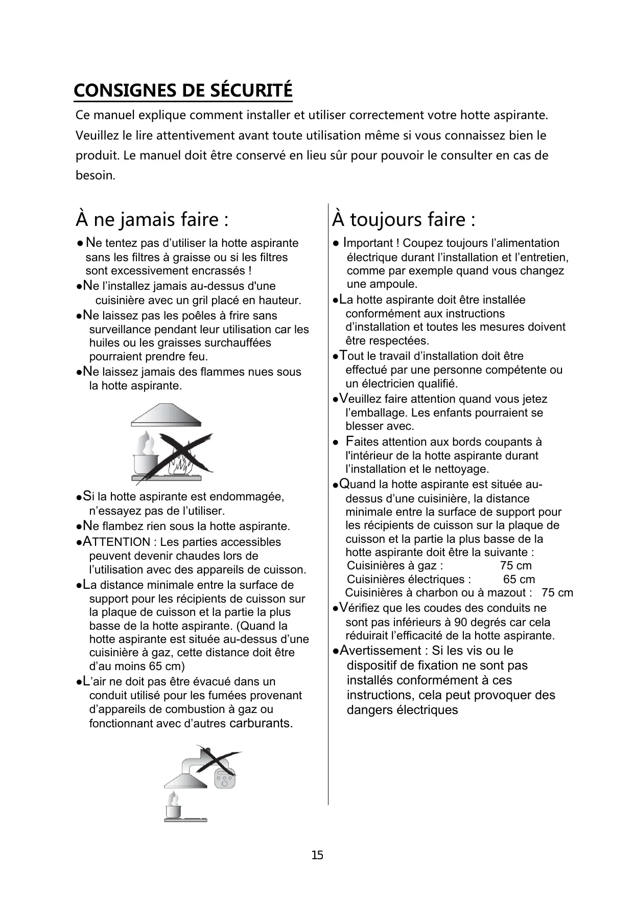 Ce manuel explique comment installer et utiliser correctement votre hotte aspirante. Veuillez le lire attentivement avant toute utilisation même si vous connaissez bien le produit. Le manuel doit être conservé en lieu sûr pour pouvoir le consulter en cas de besoin. À ne jamais faire : À toujours faire : ● Ne tentez pas d’utiliser la hotte aspirante ● Important ! Coupez toujours l’alimentation sans les filtres à graisse ou si les filtres sont excessivement encrassés ! ●Ne l’installez jamais au-dessus d'une cuisinière avec un gril placé en hauteur. ●Ne laissez pas les poêles à frire sans surveillance pendant leur utilisation car les huiles ou les graisses surchauffées pourraient prendre feu. ●Ne laissez jamais des flammes nues sous la hotte aspirante. électrique durant l’installation et l’entretien, comme par exemple quand vous changez une ampoule. ●La hotte aspirante doit être installée conformément aux instructions d’installation et toutes les mesures doivent être respectées. ●Tout le travail d’installation doit être effectué par une personne compétente ou un électricien qualifié. ●Veuillez faire attention quand vous jetez l’emballage. Les enfants pourraient se blesser avec. ● Faites attention aux bords coupants à l'intérieur de la hotte aspirante durant l’installation et le nettoyage. ●Quand la hotte aspirante est située audessus d’une cuisinière, la distance minimale entre la surface de support pour les récipients de cuisson sur la plaque de cuisson et la partie la plus basse de la hotte aspirante doit être la suivante : Cuisinières à gaz : 75 cm Cuisinières électriques : 65 cm Cuisinières à charbon ou à mazout : 75 cm ●Vérifiez que les coudes des conduits ne sont pas inférieurs à 90 degrés car cela réduirait l’efficacité de la hotte aspirante. ●Si la hotte aspirante est endommagée, n’essayez pas de l’utiliser. ●Ne flambez rien sous la hotte aspirante. ●ATTENTION : Les parties accessibles peuvent devenir chaudes lors de l’utilisation avec des appareils de cuisson. ●La distance minimale entre la surface de support pour les récipients de cuisson sur la plaque de cuisson et la partie la plus basse de la hotte aspirante. (Quand la hotte aspirante est située au-dessus d’une cuisinière à gaz, cette distance doit être d’au moins 65 cm) ●L’air ne doit pas être évacué dans un conduit utilisé pour les fumées provenant d’appareils de combustion à gaz ou fonctionnant avec d’autres carburants. ●Avertissement : Si les vis ou le dispositif de fixation ne sont pas installés conformément à ces instructions, cela peut provoquer des dangers électriques