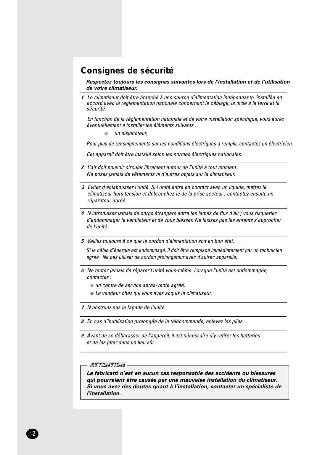 Consignes de sécurité Respectez toujours les consignes suivantes lors de l’installation et de l’utilisation de votre climatiseur. 1 Le climatiseur doit être branché à une source d’alimentation indépendante, installée en accord avec la réglementation nationale concernant le câblage, la mise à la terre et la sécurité. En fonction de la réglementation nationale et de votre installation spécifique, vous aurez éventuellement à installer les éléments suivants : ◆ un disjoncteur, Pour plus de renseignements sur les conditions électriques à remplir, contactez un électricien. Cet appareil doit être installé selon les normes électriques nationales. 2 L’air doit pouvoir circuler librement autour de l’unité à tout moment. Ne posez jamais de vêtements ni d’autres objets sur le climatiseur. 3 Évitez d’éclabousser l’unité. Si l’unité entre en contact avec un liquide, mettez le climatiseur hors tension et débranchez-le de la prise secteur ; contactez ensuite un réparateur agréé. 4 N’introduisez jamais de corps étrangers entre les lames de flux d’air ; vous risqueriez d’endommager le ventilateur et de vous blesser. Ne laissez pas les enfants s’approcher de l’unité. 5 Veillez toujours à ce que le cordon d’alimentation soit en bon état. Si le câble d’énergie est endommagé, il doit être remplacé immédiatement par un technicien agréé. Ne pas utiliser de cordon prolongatour avec d’autrec appareile. 6 Ne tentez jamais de réparer l’unité vous-même. Lorsque l’unité est endommagée, contactez : ◆ un centre de service après-vente agréé, ◆ Le vendeur chez qui vous avez acquis le climatiseur. 7 N’obstruez pas la façade de l’unité. 8 En cas d’inutilisation prolongée de la télécommande, enlevez les piles. 9 Avant de se débarasser de l’appareil, il est nécessaire d’y retirer les batteries et de les jeter dans un lieu sûr. AT T E N T I O N Le fabricant n’est en aucun cas responsable des accidents ou blessures qui pourraient être causés par une mauvaise installation du climatiseur. Si vous avez des doutes quant à l’installation, contacter un spécialiste de l’installation. F-2 Sommaire