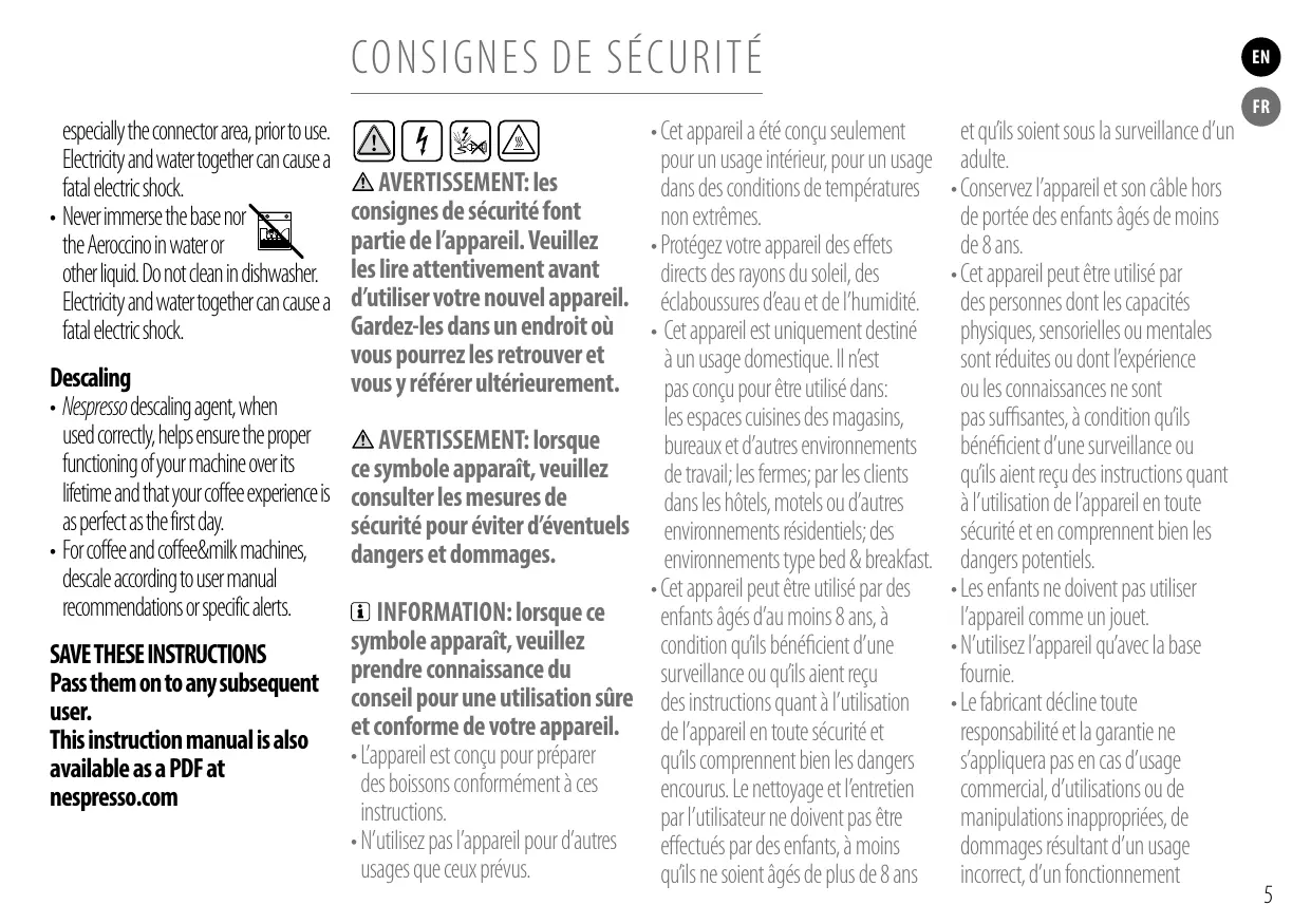 • Lorsqu’il est utilisé correctement, le Nettoyage de l’Aeroccino détartrant Nespresso permet d’assurer • Débranchez l’appareil en cas de non- le bon fonctionnement de votre utilisation prolongée et avant toute machine tout au long de sa durée de opération de nettoyage. Laissez-le vie et de vous garantir une expérience refroidir avant de retirer ou de replacer de dégustation optimale, tasse après les pièces, et de le nettoyer. Retirez tasse. l’appareil de sa base avant de le • Pour les machines, procédez au nettoyer. détartrage conformément aux • Veillez à ce que la partie inférieure recommandations présentées dans de l’Aeroccino et la le manuel utilisateur ou aux alertes surface située sous spécifiques. la base soient sèches avant toute CONSERVEZ LES utilisation, et tout particulièrement la INSTRUCTIONS SUIVANTES zone du connecteur. La présence Transmettez-les aux utilisateurs simultanée d’électricité et d’eau peut ultérieurs. provoquer des décharges électriques Ce manuel d’instruction est mortelles. également disponible en • N’immergez pas la base ou l’Aeroccino version PDF sur nespresso.com