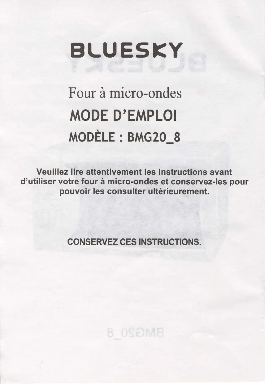 BLUESKY BMG2O-8 BLUESKY Fourà micro-ondes MODED'EMPLOI MODELE : BMG208 Veuillezlire attentivementles instructionsavant d'utiliser votre four à micro-ondeset conservez-lespour pouvoirles consulterultérieurement. CONSERVEZ CESINSTRUCTIONS.