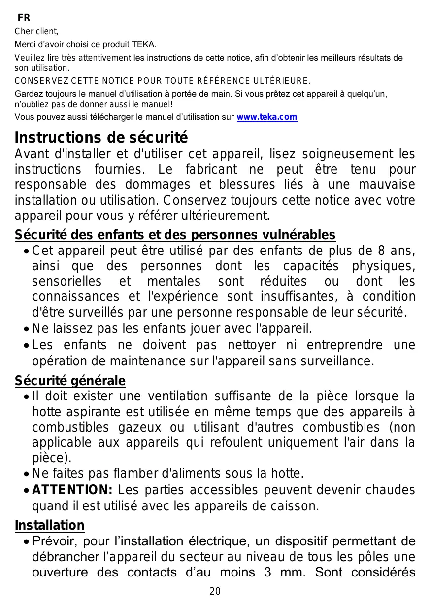 Avant d'installer et d'utiliser cet appareil, lisez soigneusement les instructions fournies. Le fabricant ne peut être tenu pour responsable des dommages et blessures liés à une mauvaise installation ou utilisation. Conservez toujours cette notice avec votre appareil pour vous y référer ultérieurement. Sécurité des enfants et des personnes vulnérables • Cet appareil peut être utilisé par des enfants de plus de 8 ans, ainsi que des personnes dont les capacités physiques, sensorielles et mentales sont réduites ou dont les connaissances et l'expérience sont insuffisantes, à condition d'être surveillés par une personne responsable de leur sécurité. • Ne laissez pas les enfants jouer avec l'appareil. • Les enfants ne doivent pas nettoyer ni entreprendre une opération de maintenance sur l'appareil sans surveillance. Sécurité générale • Il doit exister une ventilation suffisante de la pièce lorsque la hotte aspirante est utilisée en même temps que des appareils à combustibles gazeux ou utilisant d'autres combustibles (non applicable aux appareils qui refoulent uniquement l'air dans la pièce). • Ne faites pas flamber d'aliments sous la hotte. • ATTENTION: Les parties accessibles peuvent devenir chaudes quand il est utilisé avec les appareils de caisson. Installation • Prévoir, pour l’installation électrique, un dispositif permettant de débrancher l’appareil du secteur au niveau de tous les pôles une ouverture des contacts d’au moins 3 mm. Sont considérés 20