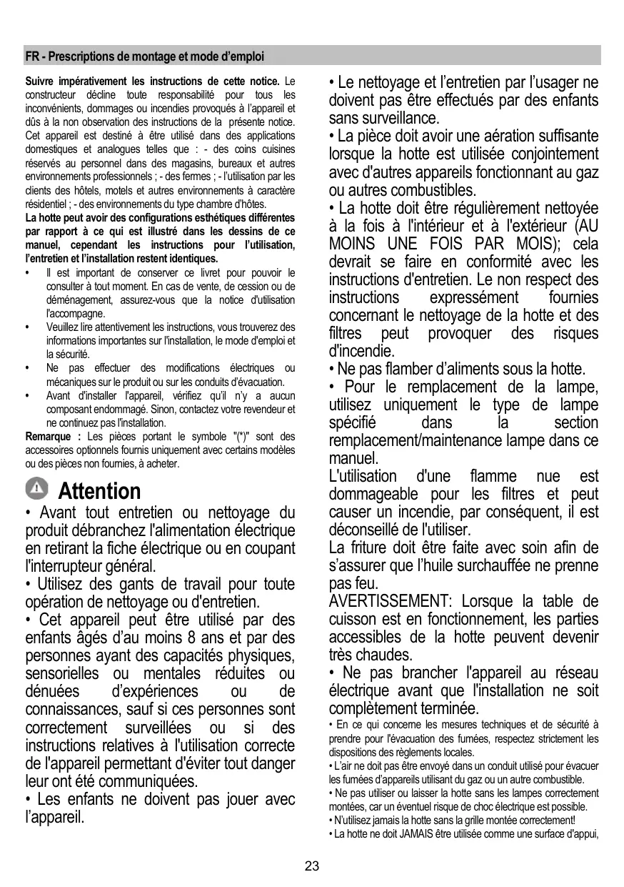 • La pièce doit avoir une aération suffisante lorsque la hotte est utilisée conjointement avec d'autres appareils fonctionnant au gaz ou autres combustibles. • La hotte doit être régulièrement nettoyée à la fois à l'intérieur et à l'extérieur (AU MOINS UNE FOIS PAR MOIS); cela devrait se faire en conformité avec les instructions d'entretien. Le non respect des instructions expressément fournies concernant le nettoyage de la hotte et des filtres peut provoquer des risques d'incendie. • Ne pas flamber d’aliments sous la hotte. • Pour le remplacement de la lampe, utilisez uniquement le type de lampe spécifié dans la section remplacement/maintenance lampe dans ce manuel. L'utilisation d'une flamme nue est dommageable pour les filtres et peut causer un incendie, par conséquent, il est déconseillé de l'utiliser. La friture doit être faite avec soin afin de s’assurer que l’huile surchauffée ne prenne pas feu. AVERTISSEMENT: Lorsque la table de cuisson est en fonctionnement, les parties accessibles de la hotte peuvent devenir très chaudes. • Ne pas brancher l'appareil au réseau électrique avant que l'installation ne soit complètement terminée.