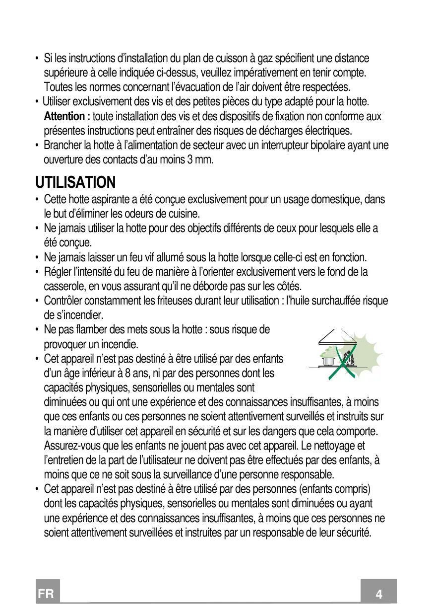 - Ne jamais laisser un feu vif allumé sous la hotte lorsque celle-ci est en fonction.