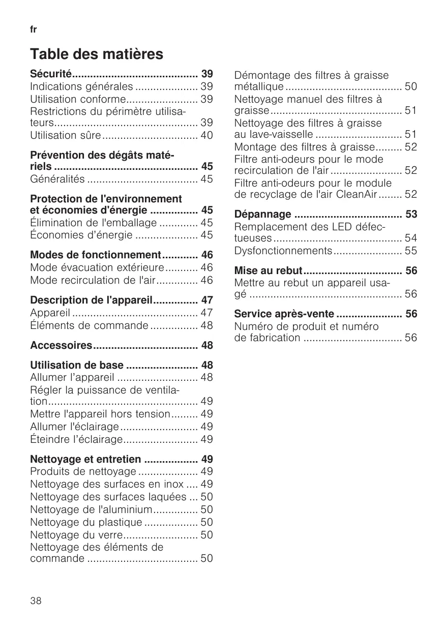 Table des matières Sécurité 39 Indications générales 39 Utilisation conforme 39 Restrictions du périmètre utilisateurs 39 Utilisation sûre 40 Prévention des dégâts matériels 45 Généralités 45 Protection de l'environnement et économies d'énergie 45 Élimination de l'emballage 45 Économies d’énergie 45 Modes de fonctionnement 46 Mode évacuation extérieure 46 Mode recirculation de l'air 46 Description de l'appareil 47 Appareil 47 Éléments de commande 48 Accessoires 48 Utilisation de base 48 Allumer l’appareil 48 Régler la puissance de ventilation 49 Mettre l'appareil hors tension 49 Allumer l'éclairage 49 Éteindre l’éclairage 49 Nettoyage et entretien 49 Produits de nettoyage 49 Nettoyage des surfaces en inox .... 49 Nettoyage des surfaces laquées ... 50 Nettoyage de l'aluminium 50 Nettoyage du plastique 50 Nettoyage du verre 50 Nettoyage des éléments de commande 50