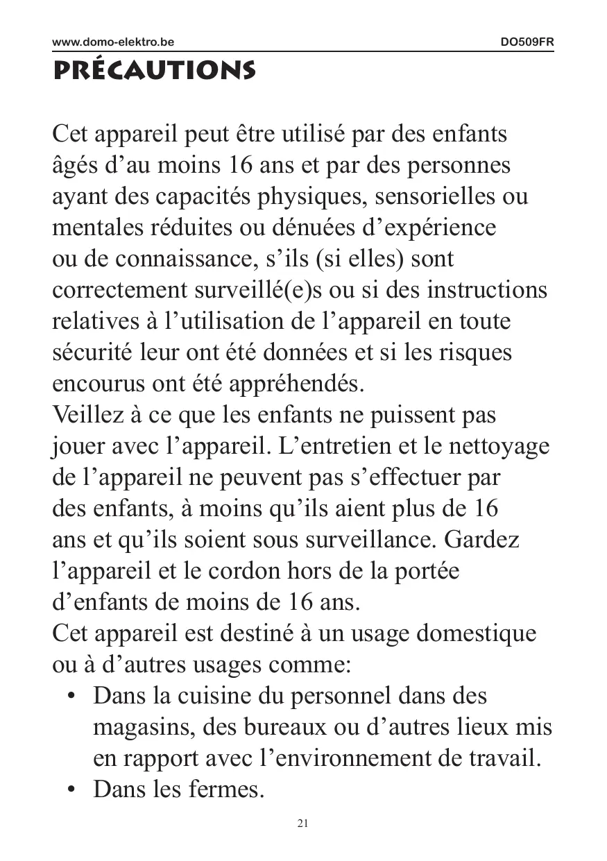 âgés d’au moins 16 ans et par des personnes ayant des capacités physiques, sensorielles ou mentales réduites ou dénuées d’expérience ou de connaissance, s’ils (si elles) sont correctement surveillé(e)s ou si des instructions relatives à l’utilisation de l’appareil en toute sécurité leur ont été données et si les risques encourus ont été appréhendés. Veillez à ce que les enfants ne puissent pas jouer avec l’appareil. L’entretien et le nettoyage de l’appareil ne peuvent pas s’effectuer par des enfants, à moins qu’ils aient plus de 16 ans et qu’ils soient sous surveillance. Gardez l’appareil et le cordon hors de la portée d’enfants de moins de 16 ans. Cet appareil est destiné à un usage domestique ou à d’autres usages comme: • Dans la cuisine du personnel dans des magasins, des bureaux ou d’autres lieux mis en rapport avec l’environnement de travail. • Dans les fermes. 21