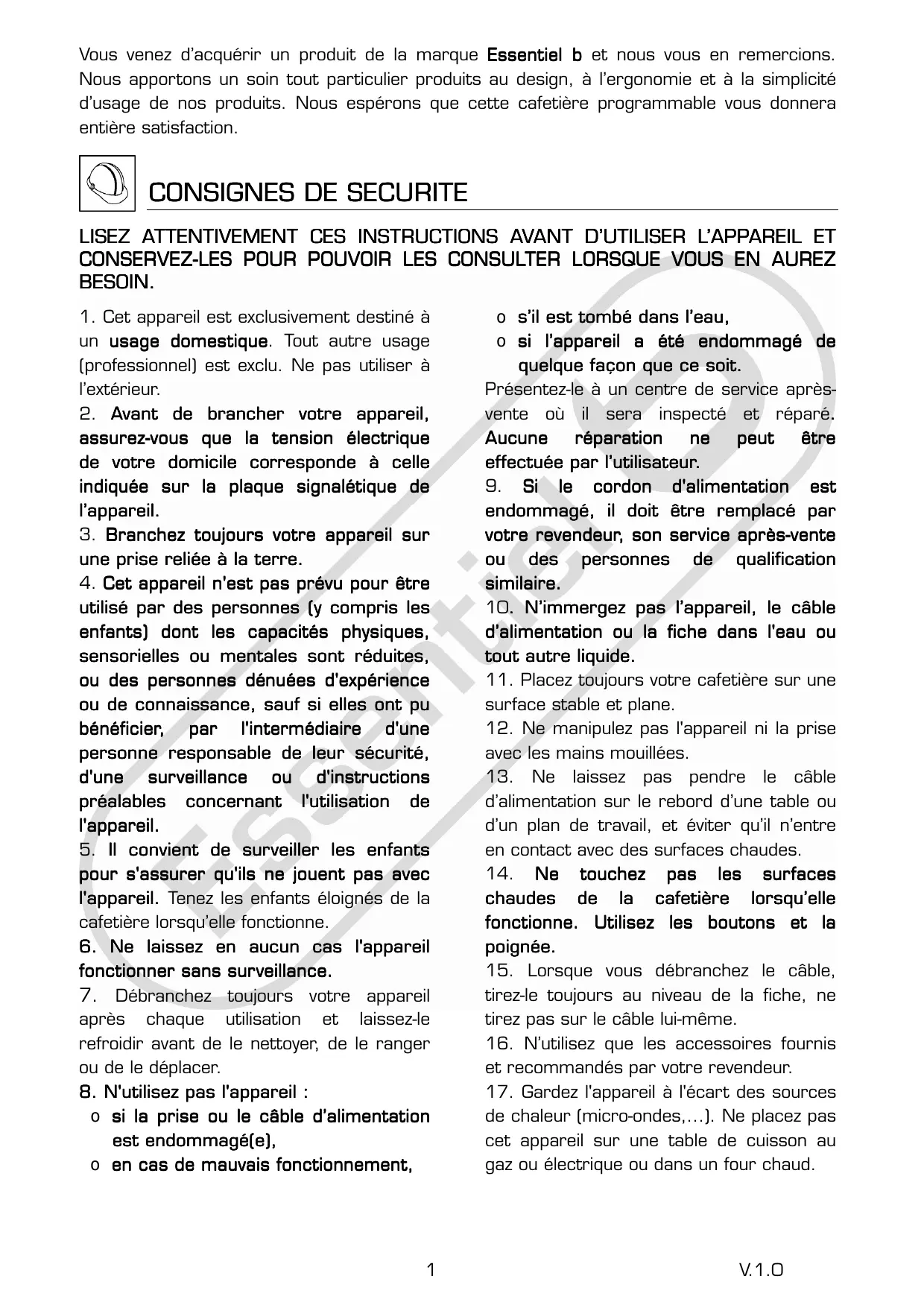 Vous venez d’acquérir un produit de la marque Essentiel b et nous vous en remercions. Nous apportons un soin tout particulier produits au design, à l’ergonomie et à la simplicité d’usage de nos produits. Nous espérons que cette cafetière programmable vous donnera entière satisfaction.