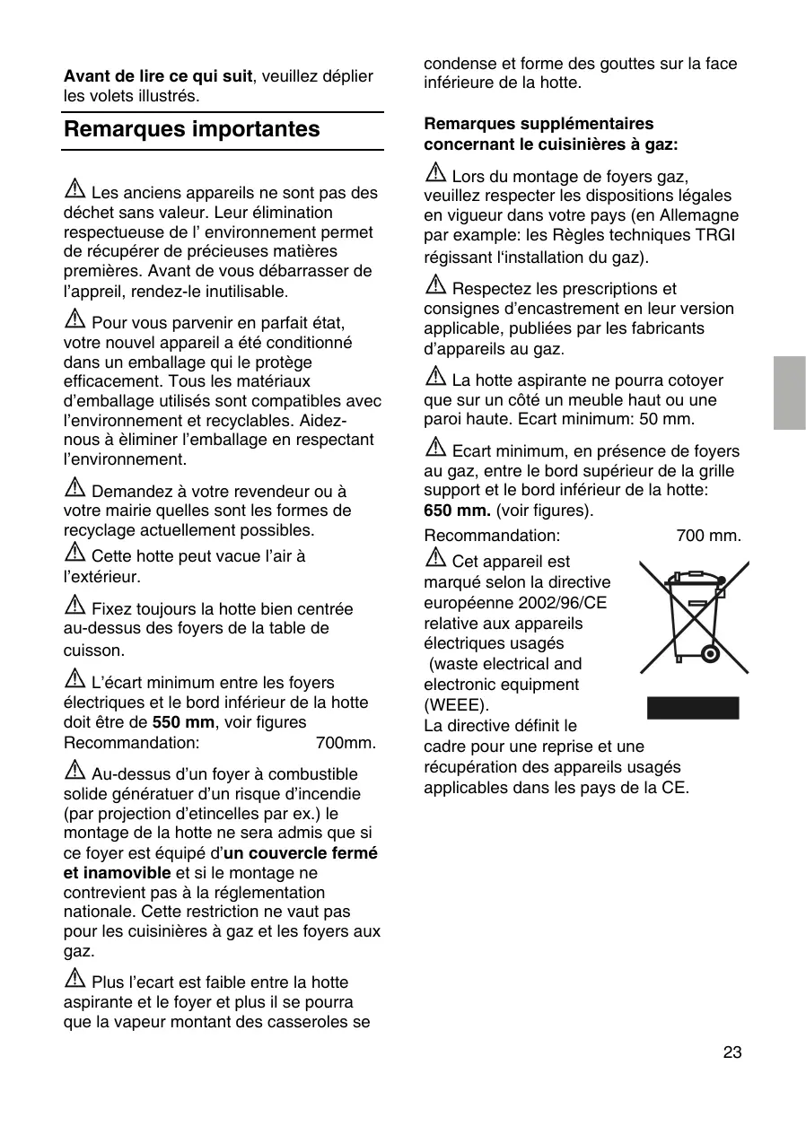 Remarques supplémentaires concernant le cuisinières à gaz: Lors du montage de foyers gaz, veuillez respecter les dispositions légales en vigueur dans votre pays (en Allemagne par example: les Règles techniques TRGI régissant l‘installation du gaz). Respectez les prescriptions et consignes d’encastrement en leur version applicable, publiées par les fabricants d’appareils au gaz. La hotte aspirante ne pourra cotoyer que sur un côté un meuble haut ou une paroi haute. Ecart minimum: 50 mm. Ecart minimum, en présence de foyers au gaz, entre le bord supérieur de la grille support et le bord inférieur de la hotte: 650 mm. (voir figures). Recommandation: 700 mm. Cet appareil est marqué selon la directive européenne 2002/96/CE relative aux appareils électriques usagés (waste electrical and electronic equipment (WEEE). La directive définit le cadre pour une reprise et une récupération des appareils usagés applicables dans les pays de la CE.