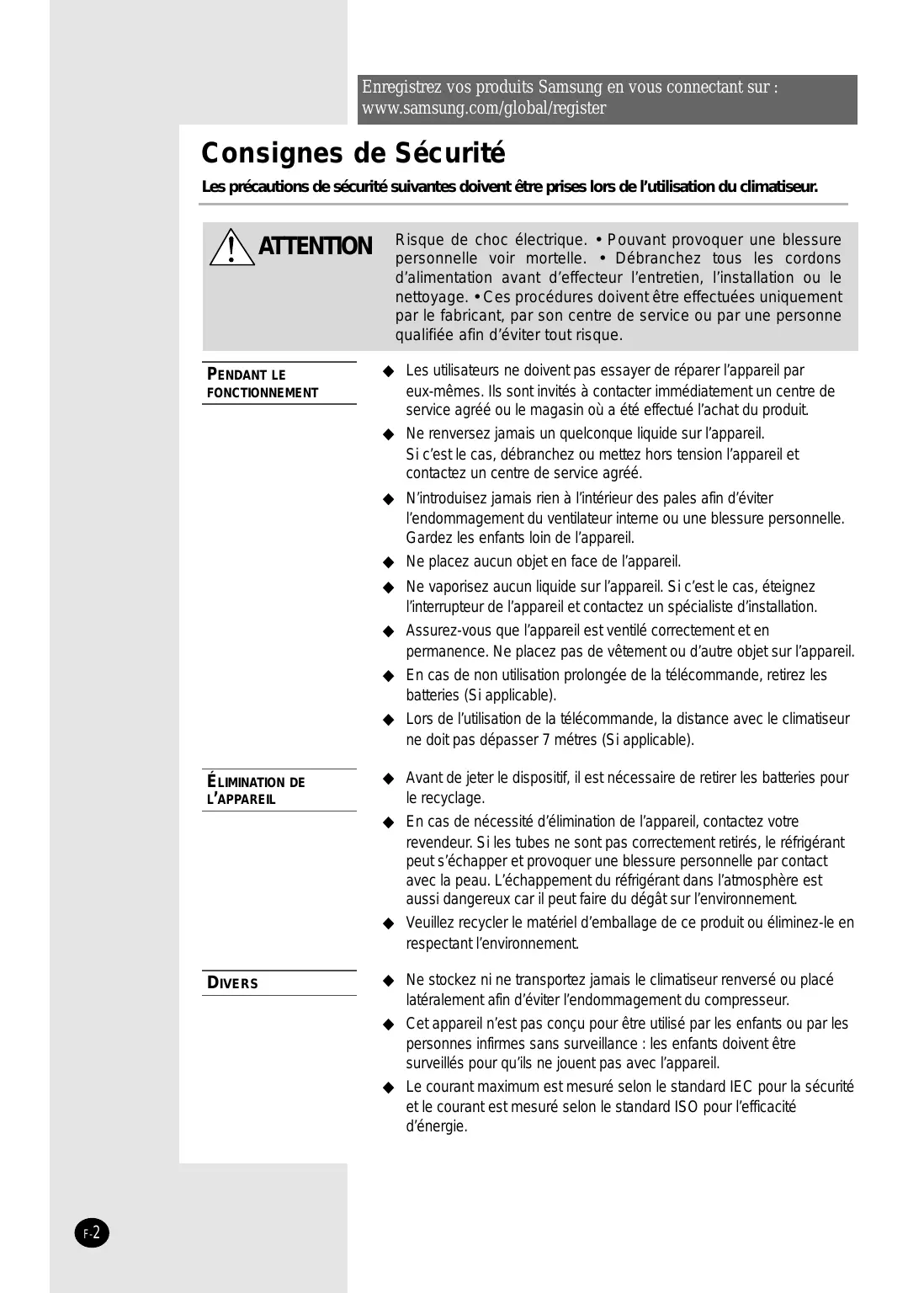 GEBRAUCHSANWEISUNG E S F I P D G R DB98-08777A(7) Enregistrez vos produits Samsung en vous connectant sur : www.samsung.com/global/register Consignes de Sécurité Les précautions de sécurité suivantes doivent être prises lors de l’utilisation du climatiseur. ATTENTION PENDANT LE FONCTIONNEMENT Risque de choc électrique. • Pouvant provoquer une blessure personnelle voir mortelle. • Débranchez tous les cordons d’alimentation avant d’effecteur l’entretien, l’installation ou le nettoyage. • Ces procédures doivent être effectuées uniquement par le fabricant, par son centre de service ou par une personne qualifiée afin d’éviter tout risque. ◆ Les utilisateurs ne doivent pas essayer de réparer l’appareil par eux-mêmes. Ils sont invités à contacter immédiatement un centre de service agréé ou le magasin où a été effectué l’achat du produit. ◆ Ne renversez jamais un quelconque liquide sur l’appareil. Si c’est le cas, débranchez ou mettez hors tension l’appareil et contactez un centre de service agréé. ◆ N’introduisez jamais rien à l’intérieur des pales afin d’éviter l’endommagement du ventilateur interne ou une blessure personnelle. Gardez les enfants loin de l’appareil. ◆ Ne placez aucun objet en face de l’appareil. ◆ Ne vaporisez aucun liquide sur l’appareil. Si c’est le cas, éteignez l’interrupteur de l’appareil et contactez un spécialiste d’installation. ◆ Assurez-vous que l’appareil est ventilé correctement et en permanence. Ne placez pas de vêtement ou d’autre objet sur l’appareil. ◆ En cas de non utilisation prolongée de la télécommande, retirez les batteries (Si applicable). ◆ Lors de l’utilisation de la télécommande, la distance avec le climatiseur ne doit pas dépasser 7 métres (Si applicable). ÉLIMINATION DE L’APPAREIL ◆ Avant de jeter le dispositif, il est nécessaire de retirer les batteries pour le recyclage. ◆ En cas de nécessité d’élimination de l’appareil, contactez votre revendeur. Si les tubes ne sont pas correctement retirés, le réfrigérant peut s’échapper et provoquer une blessure personnelle par contact avec la peau. L’échappement du réfrigérant dans l’atmosphère est aussi dangereux car il peut faire du dégât sur l’environnement. ◆ Veuillez recycler le matériel d’emballage de ce produit ou éliminez-le en respectant l’environnement. DIVERS ◆ Ne stockez ni ne transportez jamais le climatiseur renversé ou placé latéralement afin d’éviter l’endommagement du compresseur. ◆ Cet appareil n’est pas conçu pour être utilisé par les enfants ou par les personnes infirmes sans surveillance : les enfants doivent être surveillés pour qu’ils ne jouent pas avec l’appareil. ◆ Le courant maximum est mesuré selon le standard IEC pour la sécurité et le courant est mesuré selon le standard ISO pour l’efficacité d’énergie. F-2 Sommaire FRANÇAIS