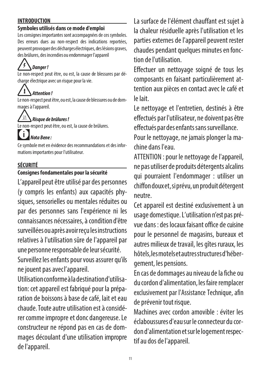 La surface de l'élément chauffant est sujet à la chaleur résiduelle après l'utilisation et les parties externes de l'appareil peuvent rester chaudes pendant quelques minutes en fonction de l'utilisation. Effectuer un nettoyage soigné de tous les composants en faisant particulièrement attention aux pièces en contact avec le café et le lait. Le nettoyage et l'entretien, destinés à être effectués par l'utilisateur, ne doivent pas être effectués par des enfants sans surveillance. Pour le nettoyage, ne jamais plonger la machine dans l'eau. ATTENTION : pour le nettoyage de l'appareil, ne pas utiliser de produits détergents alcalins qui pourraient l'endommager : utiliser un chiffon doux et, si prévu, un produit détergent neutre. Cet appareil est destiné exclusivement à un usage domestique. L’utilisation n’est pas prévue dans : des locaux faisant office de cuisine pour le personnel de magasins, bureaux et autres milieux de travail, les gîtes ruraux, les hôtels,les motels et autres structures d'hébergement, les pensions. En cas de dommages au niveau de la fiche ou du cordon d'alimentation, les faire remplacer exclusivement par l'Assistance Technique, afin de prévenir tout risque. Machines avec cordon amovible : éviter les éclaboussures d'eau sur le connecteur du cordon d'alimentation et sur le logement respectif au dos de l'appareil.